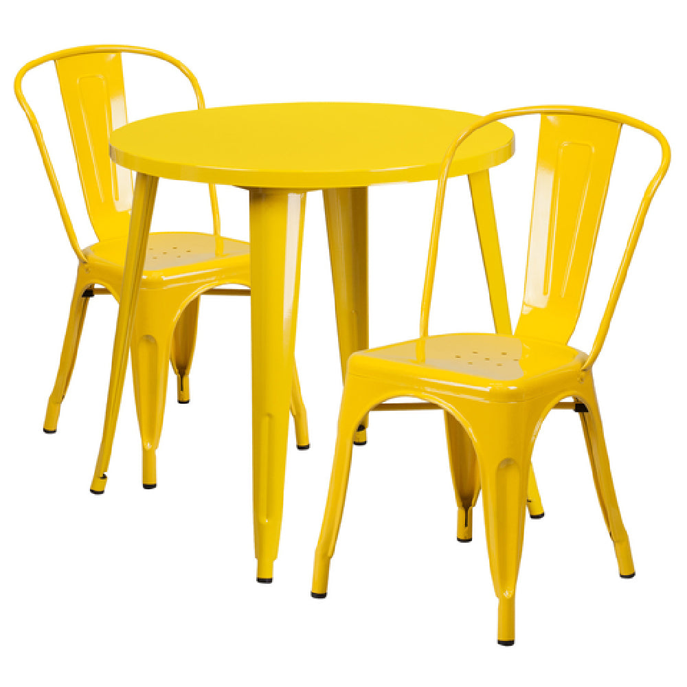 The Flash Furniture CH-51090TH-2-18CAFE-YL-GG set features a sturdy metal frame with a powder-coated yellow finish, suitable for outdoor environments. The table measures 30 inches in diameter and 29-1/2 inches high, with a 1-1/4 inch thick round top designed for stability and ease of cleaning. The two chairs are 18 inches wide, 20 inches deep, and 33 inches tall, with curved backs and drain holes in the seats to facilitate maintenance. The set's total weight is 63 pounds, supporting reliable handling and deployment in commercial settings. It does not specify electrical requirements or refrigeration components, focusing instead on durable construction for high-traffic outdoor hospitality spaces.