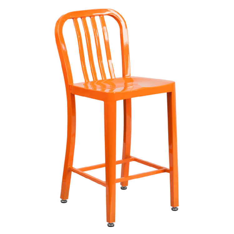 The Flash Furniture CH-61200-24-OR-GG Bar Stool is a robust commercial-grade seating solution designed for versatile indoor and outdoor use in foodservice environments. Engineered with galvanized steel and finished with a durable powder coat, this armless counter-height stool features a vertical slat metal backrest for ergonomic support. Its impressive 500 lb. weight capacity ensures stability and safety during high-traffic operations, making it suitable for bustling restaurant, bar, and café settings. Its precise height of 36.25 inches aligns with standard counter heights, providing optimal comfort for both staff and guests. This model’s technical construction emphasizes durability and ease of maintenance, accommodating demanding hospitality applications without compromising performance.