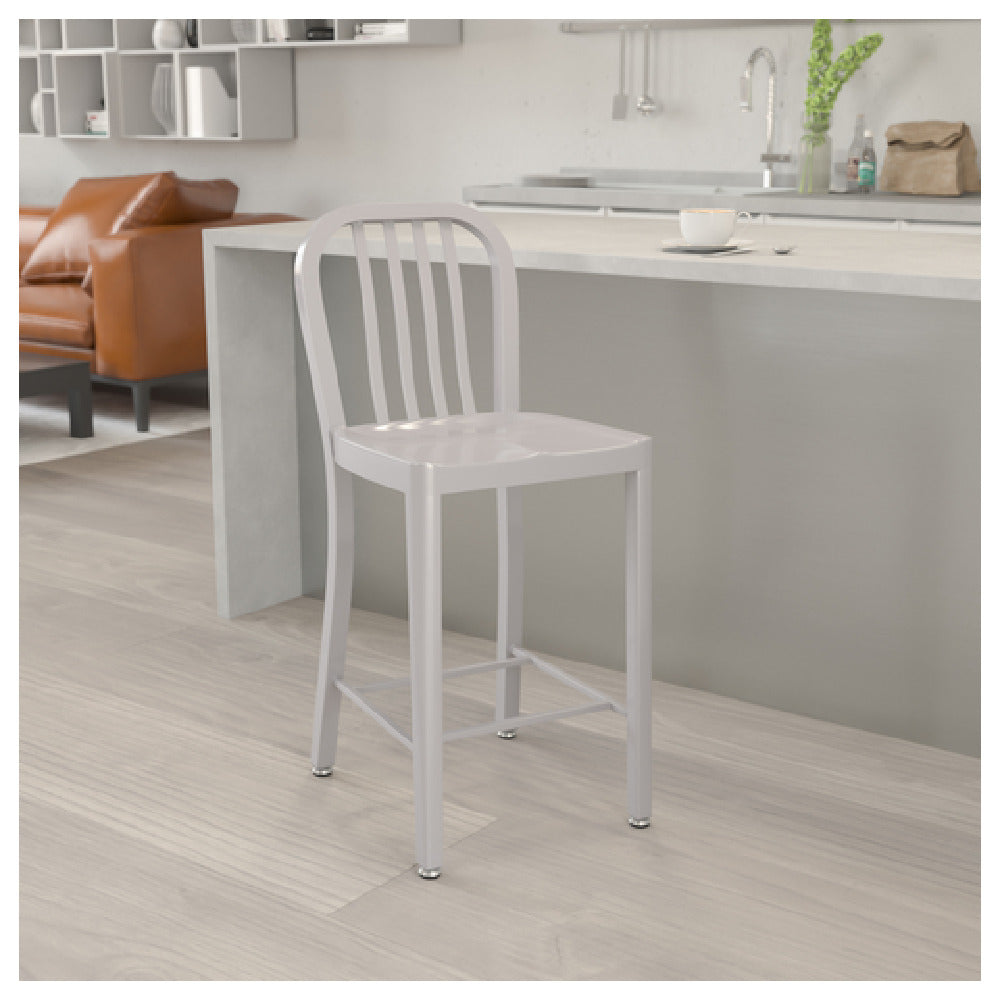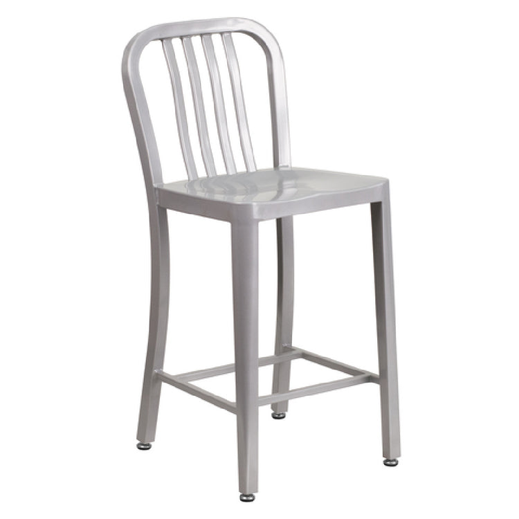 The Flash Furniture CH-61200-24-SIL-GG outdoor bar stool exemplifies durable commercial seating designed for high-capacity indoor and outdoor applications. Constructed from galvanized steel with a robust powder coat finish, this counter height stool offers a 500 lb. weight capacity, suitable for busy hospitality environments, cafes, and recreational spaces. Its vertical slat back provides ergonomic support, while its weather-resistant materials ensure longevity in various settings. Measuring 36.25 inches in height, with a 15.75-inch width and 19-inch depth, it is engineered for stability and comfort, making it an ideal choice for versatile commercial and residential venues that demand reliable, high-capacity seating solutions.