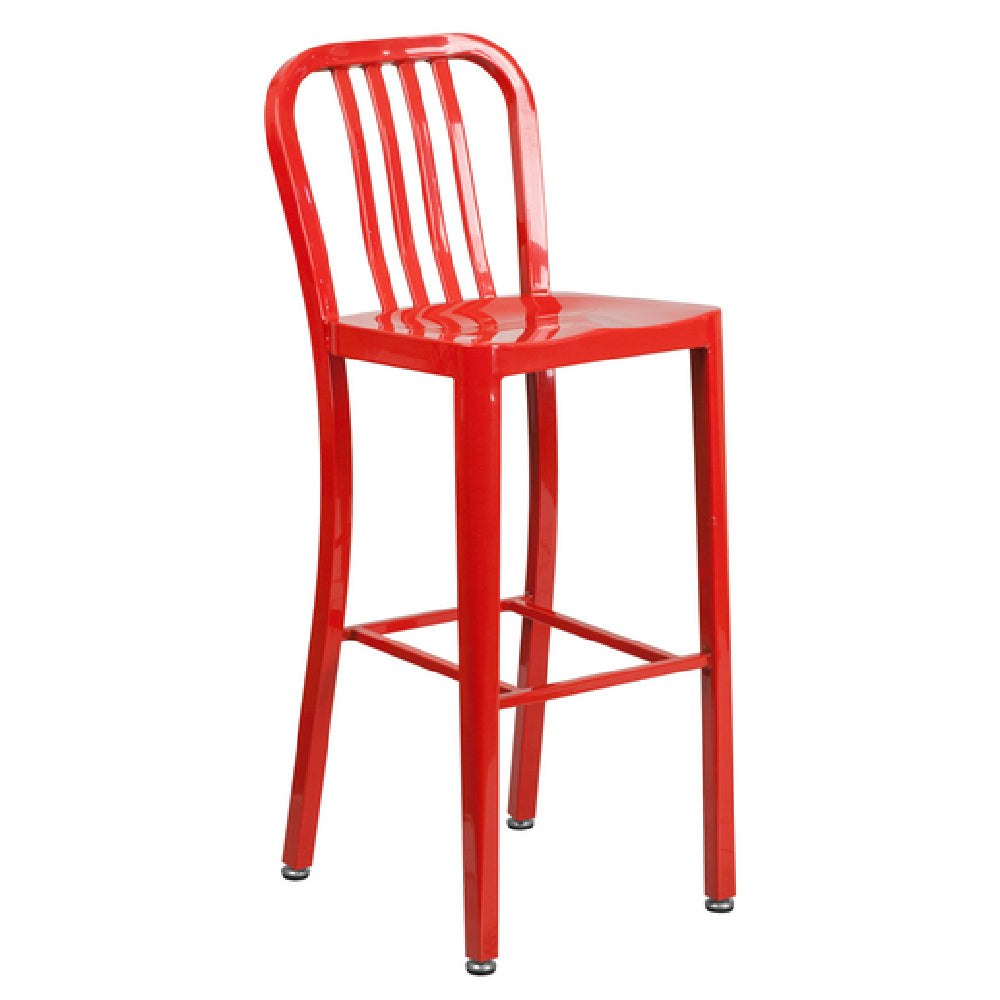 The Flash Furniture CH-61200-30-RED-GG bar stool is constructed from galvanized steel, ensuring resistance to outdoor corrosion, complemented by a durable powder coat finish in vibrant red. It has a total height of 43 inches with a seat width of 15.5 inches and a depth of 20 inches, supporting a maximum weight capacity of 500 lbs. The metal seat and backrest provide sturdy, long-lasting performance suitable for commercial environments. Assembly requires no electrical components, and it maintains safety and stability through its armless design and adjustable floor glides for level placement on uneven surfaces. The stool’s construction supports frequent cleaning and maintenance, making it suitable for high-volume service settings requiring reliability and quick turnaround.