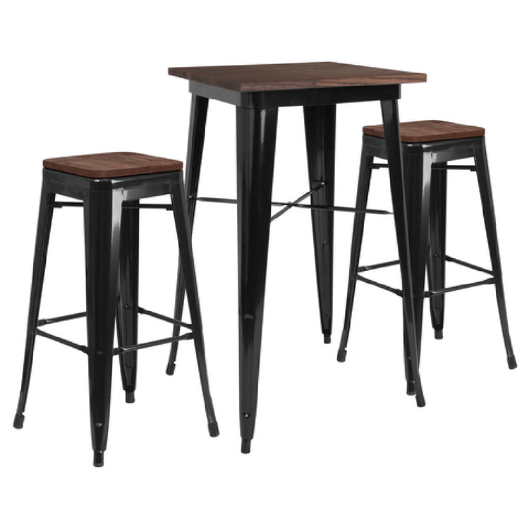 The CH-WD-TBCH-17-GG set features a 26" long side and 26" short side square table with a height of 42 inches. The elm wood top is mounted on a galvanized steel frame, ensuring structural integrity amid frequent use. Weighing approximately 81.4 lbs, this set is designed for static placement with considerations for clearance and airflow for routine cleaning. It operates as a non-electrical, water-cooled setup suitable for indoor environments. The furniture’s black finish complements various interior styles while offering resistance to staining and wear. Its construction supports regular sanitization, with dimensions optimized for efficient space utilization in commercial kitchen and dining spaces.