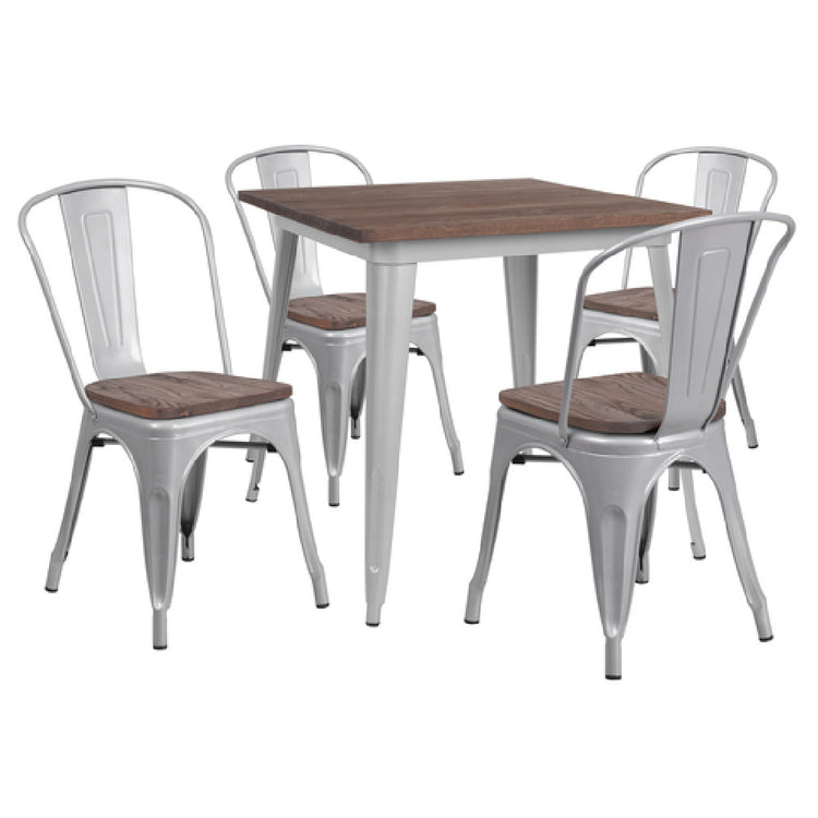 The Flash Furniture CH-WD-TBCH-4-GG is a commercial-grade chair and table set designed for indoor foodservice settings. This ensemble includes a 31-1/2" square table with an elm wood top and a galvanized steel frame, providing a durable and stable surface suitable for high-traffic environments. Accompanied by four stackable chairs, the set offers space-efficient storage and ease of setup, making it ideal for cafes, bistros, and casual dining establishments seeking reliable furniture with a modern finish.