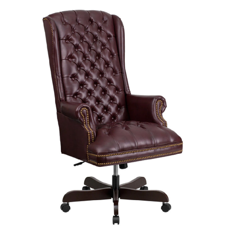 The Flash Furniture CI-360-BY-GG Traditional Executive Swivel Office Chair is a professional-grade seating solution designed for executive offices and high-performance workspaces. This chair features a high back design with button tufted upholstery crafted from LeatherSoft, offering durability and a refined appearance. With an adjustable height range from 48-1/2" to 51-1/4", it ensures ergonomic comfort for varied user preferences. Capable of supporting up to 250 pounds, it integrates a tilt lock mechanism, tilt tension adjustment, and rolled arms to enhance functional comfort in demanding office environments. Its mahogany wood capped metal base with dual wheel casters provides stability and mobility in busy workspaces, making it ideal for executive suites, conference rooms, and administrative offices.