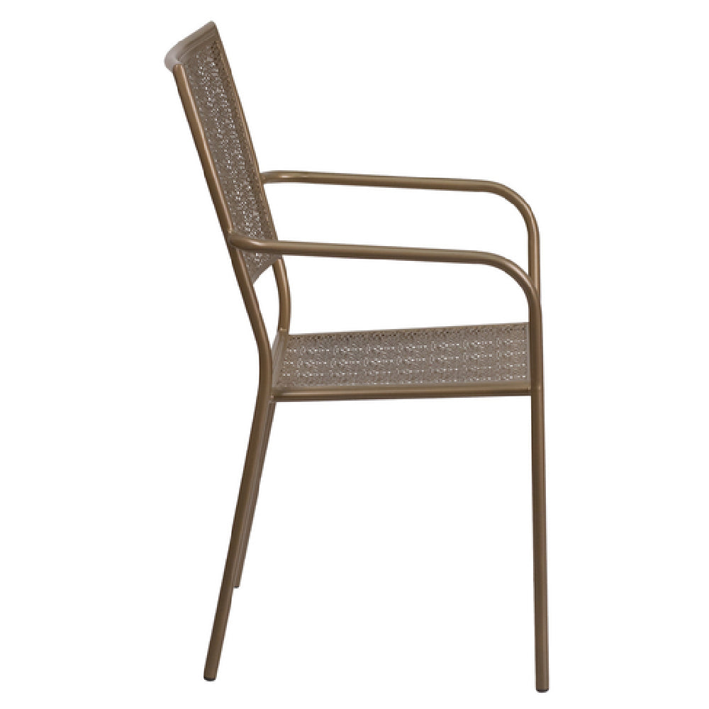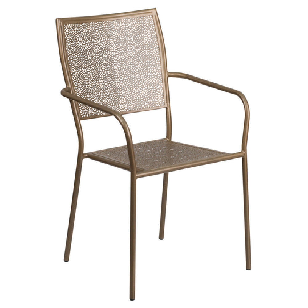 The Flash Furniture CO-2-GD-GG chair features a steel frame finished with a robust gold powder coat, offering corrosion resistance suitable for outdoor use. With a height of 35 inches, a width of 21.75 inches, and a depth of 22 inches, it provides ample seating comfort and stability. The chair's weight is 10.78 lbs, facilitating easy handling and stacking. Its back and seat are constructed from metal with decorative cut outs, adding visual detail aligned with outdoor aesthetic standards. Designed for moderate-use environments, this model supports standard outdoor seating needs without compromising durability or ease of maintenance. The lightweight yet rugged construction ensures reliability in high-traffic areas, with plastic glides protecting surfaces from scratches. No electrical or refrigeration components are involved, making it a straightforward, low-maintenance furniture choice for outdoor settings. Maintains structural integrity across typical outdoor temperature ranges, resistant to weather-related wear, and easy to clean with routine wiping or mild cleaning agents. The chair adheres to material safety standards and is suitable for various commercial spaces requiring stackable outdoor seating.