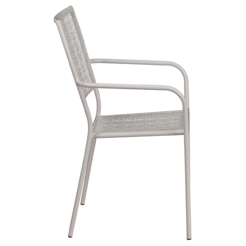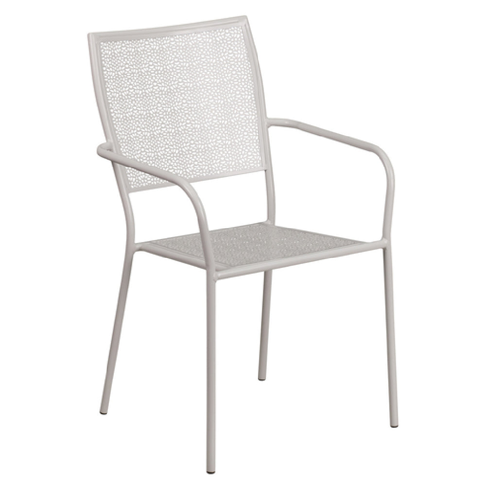 The Flash Furniture CO-2-SIL-GG Patio Stacking Armchair is a commercial-grade outdoor seating solution designed for versatile use in both indoor and outdoor environments. Constructed with a lightweight yet durable 1.2mm tubular steel frame finished in light gray powder coat, this stacking chair features a decorative square back and seat with a flower design, enhancing aesthetics while maintaining functionality. Its steel frame ensures strength and stability, suitable for high-traffic hospitality settings, outdoor patios, or indoor lounge areas. The chair's stackable design allows efficient storage, stacking up to eight units, and features plastic floor glides to prevent surface damage. Measuring 21.75 inches wide by 22 inches deep and with a height of 35 inches, it provides ergonomic support while withstanding environmental exposure and frequent use in commercial and residential contexts.