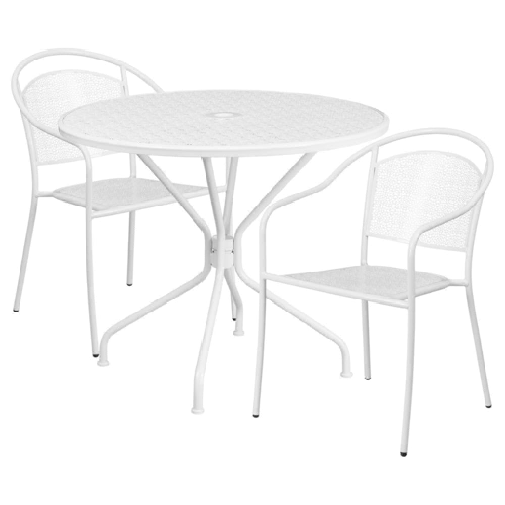 The Flash Furniture CO-35RD-03CHR2-WH-GG Patio Table Set is a durable, commercial-grade outdoor furniture ensemble designed for versatile use in hospitality and foodservice environments. Featuring a round table with a rain flower design top and a 1-1/2" diameter umbrella hole, the set provides a reliable surface for outdoor dining and social gatherings. Its construction incorporates weather-resistant steel with a powder coat finish, ensuring longevity in sun and rain conditions. The table measures 35-1/4 inches in diameter and stands at a height of 28-3/4 inches, making it suitable for hospitality patios, cafes, or outdoor seating areas. The set includes two stacking arm chairs with a round back and rain flower design back and seat, supported by a 1.2mm tubular steel frame with a 300 lb. weight capacity. These chairs are designed for efficient stacking up to eight high, with plastic floor glides for surface protection. This patio furniture set balances aesthetic appeal with technical resilience and functional design for commercial outdoor spaces.