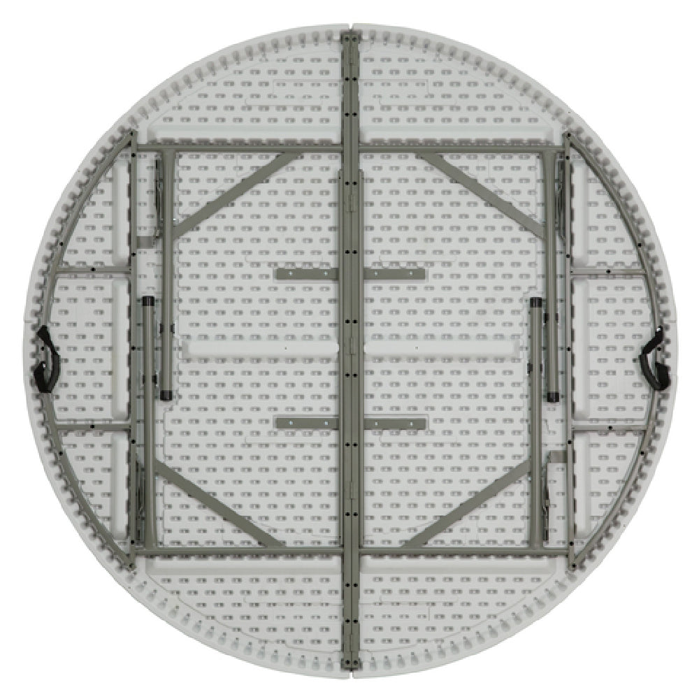 The Flash Furniture DAD-183RZ-GG folding table features a molded plastic, full-circle top in a neutral granite white finish, measuring 71 inches in diameter and 29 inches in height, supporting a static load capacity of 771 pounds. Its construction includes gray powder-coated metal locking legs with non-marring floor caps, ensuring stability and floor protection. The table weighs 71 pounds, facilitating easy handling, with a fold-in-half design for compact storage and transport. The waterproof, impact, and stain-resistant surface makes it suitable for both rigorous indoor and outdoor applications. The assembled unit does not require electrical or plumbing connections, and its simple disassembly allows for routine cleaning and maintenance. Certification status is not specified, but overall the table meets standard requirements for commercial furniture safety.