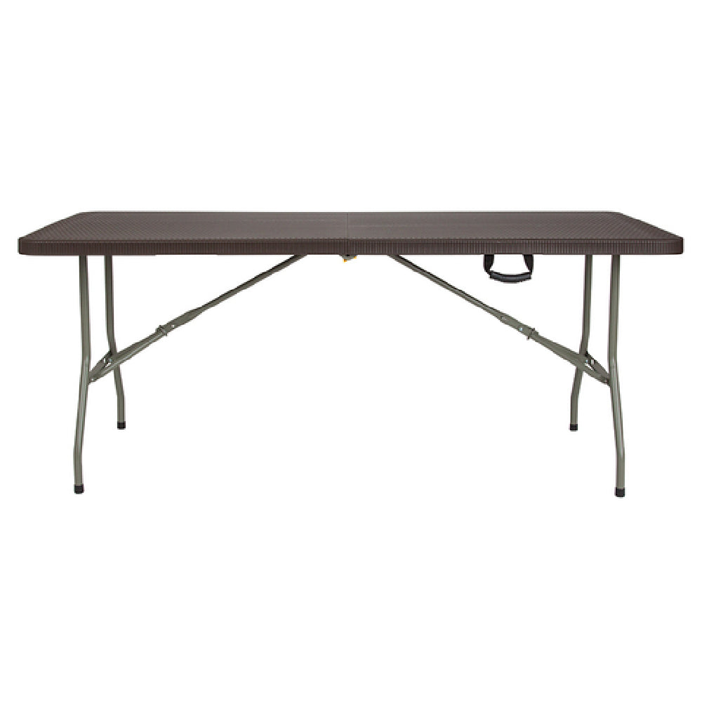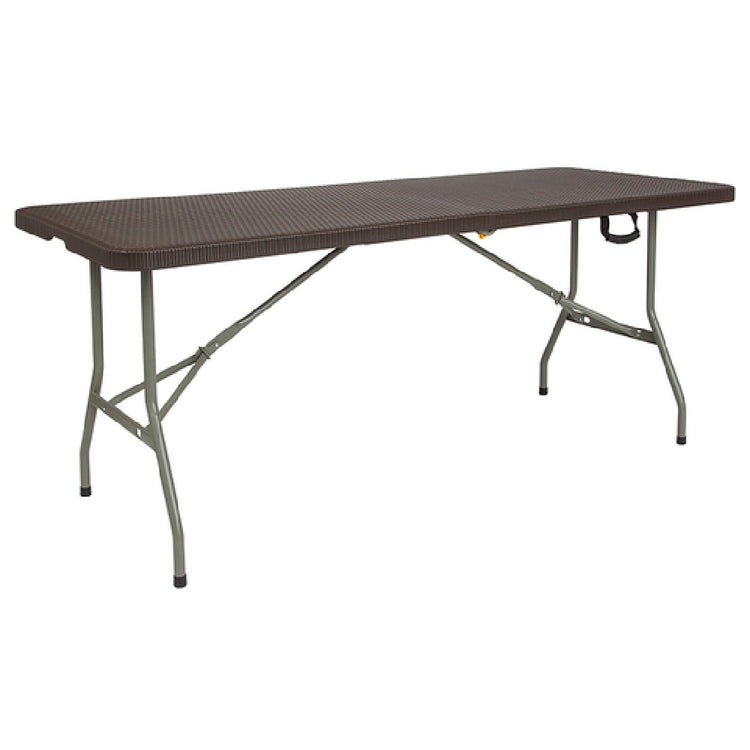 The Flash Furniture DAD-FT-180Z-GG Folding Table 71"W X 29"D X 29"H Rectangular is a commercial-grade folding table designed for versatile indoor and outdoor applications in foodservice environments. Featuring a 1-1/2'' thick brown table top with an impact- and stain-resistant rattan pattern, it provides a durable surface capable of supporting static loads up to 330 pounds. Its lightweight construction, at 31 pounds, combined with a half-fold mechanism and a carrying handle, facilitates efficient storage and transport, making it suitable for dynamic catering, banquet setups, or flexible dining areas. Its rectangular shape comfortably seats up to six adults and integrates seamlessly into various hospitality workflows, offering both resilience and portability for high-demand foodservice settings.
