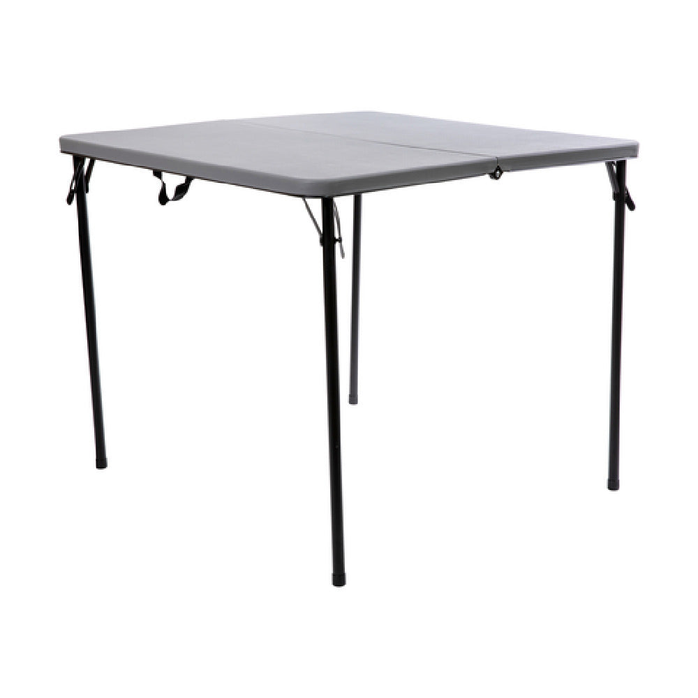 The Flash Furniture DAD-LF-86-GY-GG Folding Table is a versatile square folding table designed for commercial foodservice environments. Measuring 34 inches by 34 inches with a height of 28.5 inches, this square table features a durable 1-1/4 inch gray plastic top that is waterproof, impact, and stain resistant. Its lightweight construction of 13 pounds facilitates operational flexibility, while a static load capacity of 110 pounds accommodates various setup configurations. Folds in half for convenient storage and transport, with a built-in carrying handle and black powder-coated locking legs ensuring stability and ease of use in both indoor and outdoor settings.