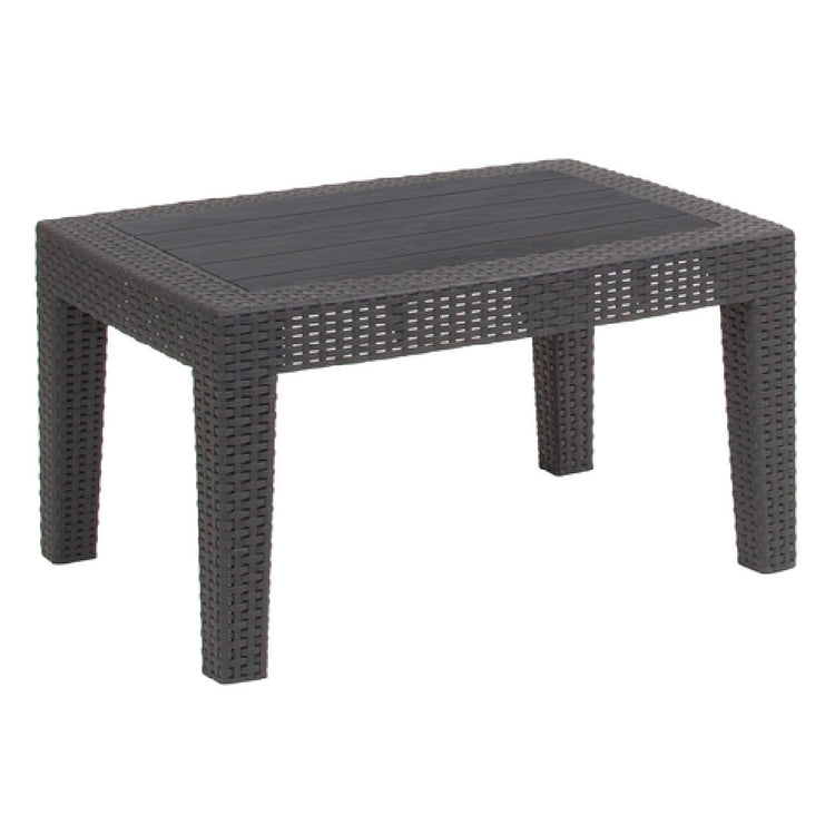The Flash Furniture DAD-SF2-T-DKGY-GG Outdoor Coffee Table is a durable, all-weather low table designed for commercial outdoor environments. Measuring 27-3/4 inches wide by 19-3/4 inches deep and standing 15 inches high, this furniture piece features a resin frame wrapped in synthetic faux rattan, providing a stylish yet weather-resistant surface. Equipped with plastic block feet for stability, it ensures consistent performance in high-traffic outdoor foodservice settings such as cafes, patios, and hospitality lounges. Its technical construction supports frequent use in professional environments, making it a reliable choice for outdoor seating areas requiring stylish, low-maintenance surface durability.