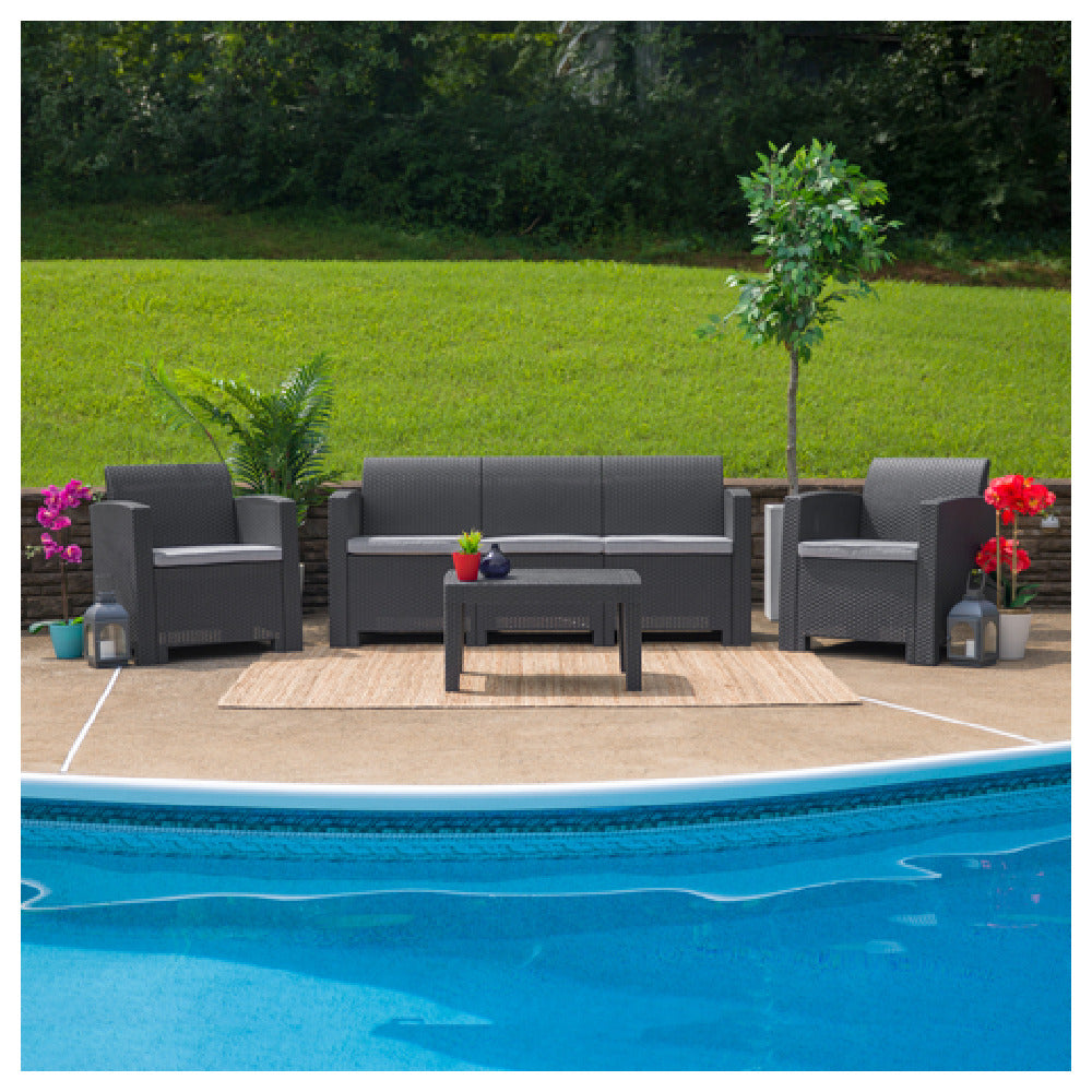 The Flash Furniture outdoor coffee table features a 15-inch height, 27-3/4-inch width, and 19-3/4-inch depth, constructed from weather-resistant materials such as a resin frame supporting faux rattan surface. Weighing 7 lbs, it offers ease of repositioning for dynamic outdoor layouts. Its finish in dark gray provides a sleek aesthetic complementing outdoor environments. The table is suitable for use in outdoor hospitality settings where exposure to sun and moisture is common, supporting moderate usage with consistent stability and minimal upkeep. Maintenance involves regular cleaning with mild solutions, and disassembly is straightforward for storage or transport. The table's dimensions and lightweight design meet operational needs for flexible outdoor area configurations, aligning with commercial outdoor furniture standards.