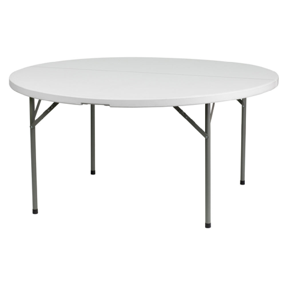 The Flash Furniture DAD-YCZ-154-GW-GG round folding table features a 60-inch diameter full circle molded plastic top with a thickness of 1-3/4 inches, mounted on durable gray powder-coated steel legs with locking functionality. It weighs approximately 50 pounds and supports a static load capacity of 661 pounds, suitable for high-traffic environments. The table's finish is impact and stain-resistant, with a waterproof surface designed for both indoor and outdoor use. Its stable construction and foldable design facilitate ease of handling, storage, and setup. While no electrical or refrigeration features are incorporated, the table’s structural integrity and weather-resistant properties ensure continuous performance in varying conditions. Its natural color and high-strength materials meet standard foodservice safety and cleaning expectations, making it fit for versatile applications.