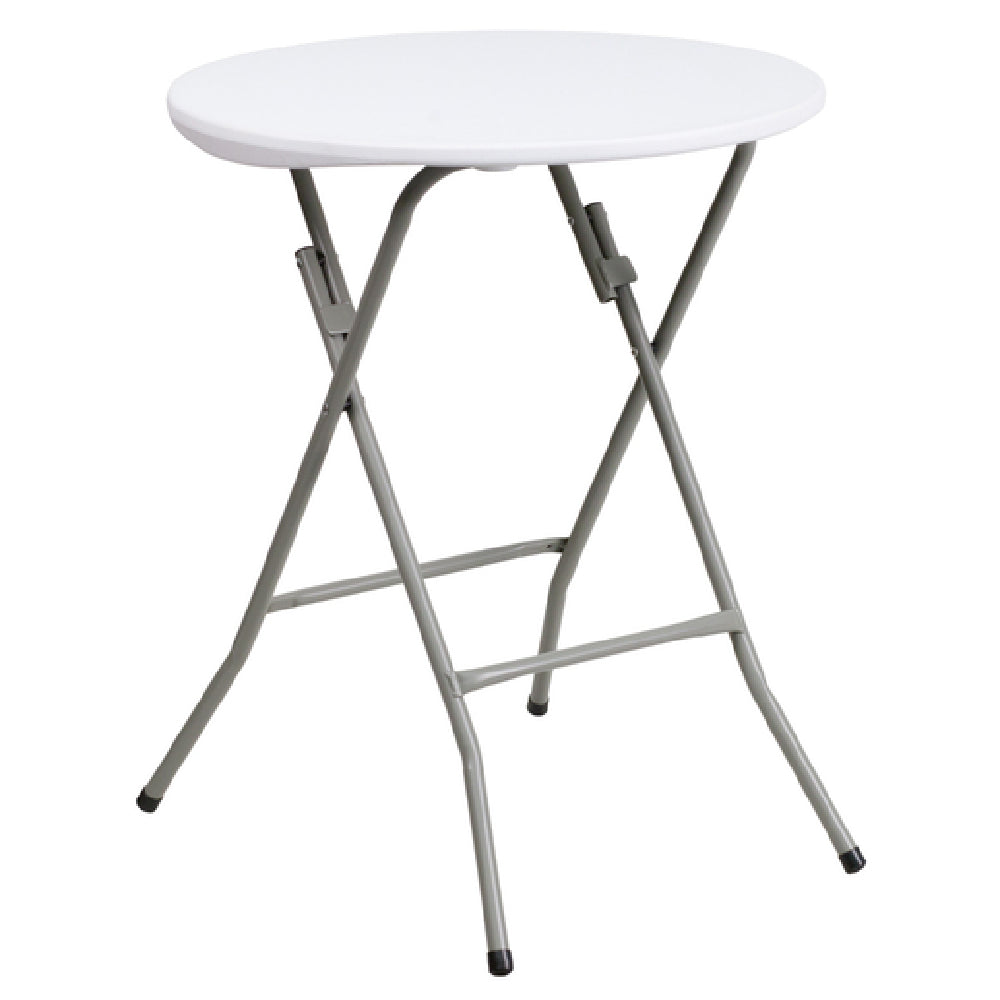 Commercial round folding tables are portable furniture units crafted for multipurpose use in hospitality, catering, or event venues. These tables feature a sturdy, impact- and water-resistant top with foldable metal legs, enabling quick deployment and compact storage. The Flash Furniture DAD-YCZ-80R-1-SM-GW-GG model, with its 24-inch diameter molded plastic top and support for up to 2 adults, exemplifies durability and versatility, making it well-suited for temporary seating arrangements, outdoor dining, or flexible event layouts in various foodservice environments. Their lightweight construction also facilitates easy transport and setup, supporting efficient workflow in busy commercial settings.