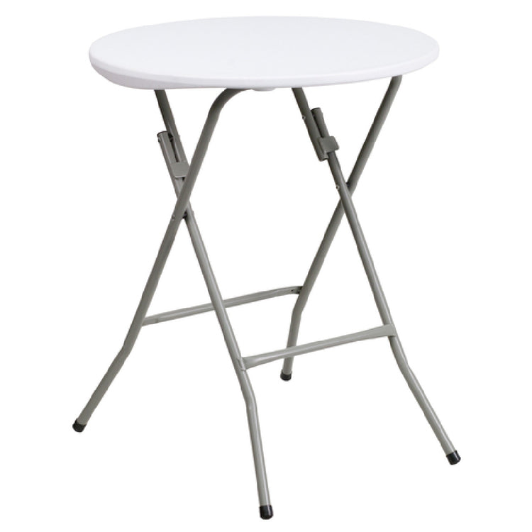 The Flash Furniture DAD-YCZ-80R-1-SM-GW-GG folding table features a molded plastic top with a 24-inch diameter and a full circle shape, weighing 10.2 pounds. The frame employs gray powder-coated steel cross legs for strength, supporting a static load capacity of 180 pounds. Its lightweight, impact, and stain-resistant surface ensure long-lasting performance in high-traffic foodservice settings. The table’s design caters to moderate workloads typical in event, outdoor, or hospitality environments. Assembly involves straightforward unfolding of the metal legs, with protective floor caps included for surface safety. Dimensions measure 24 inches in diameter and approximately 29-3/8 inches in height, fitting seamlessly into tight spaces or flexible layouts. The waterproof and impact-resistant plastic top facilitates easy cleaning and sanitation without special chemicals.
