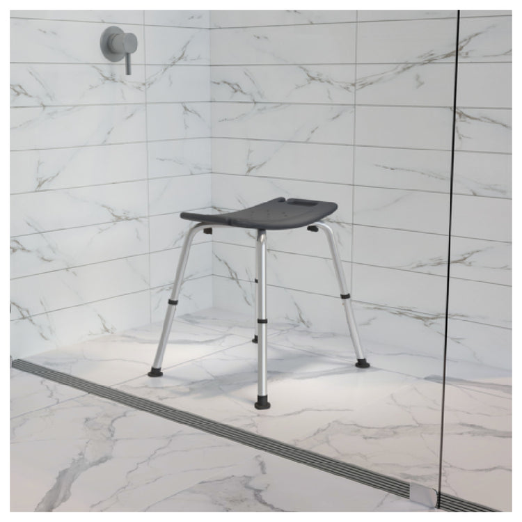 Designed for commercial healthcare and hospitality use, the Flash Furniture Hercules Series Shower Chair provides adjustable seating height with a sturdy aluminum frame. Its ergonomic saddle seat with textured surface ensures secure, comfortable positioning, while side handles support safe transfers. The 300 lb. weight capacity and non-slip rubber feet guarantee durability and safety in wet environments. Easy, tool-free assembly allows quick setup and maintenance, making it an optimal addition to institutional bathrooms, assisted living facilities, and hotel wellness areas.
