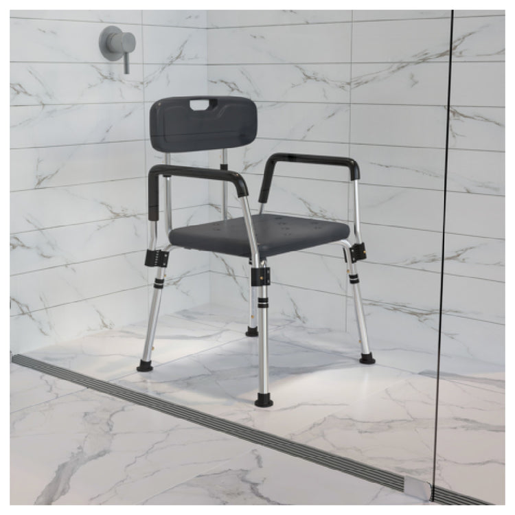 The Flash Furniture DC-HY3523L-GRY-GG Hercules Series Shower Chair is a commercial-grade indoor seating solution designed for accessibility and safety in healthcare, hospitality, and institutional environments. Engineered with a sturdy aluminum frame and a non-slip rubber foot design, this adjustable-height shower chair offers a reliable weight capacity of 300 lb., making it suitable for users with mobility challenges. The plastic seat and back are textured with drainage holes to promote hygiene and prevent water pooling. Its quick-release back and arms facilitate effortless cleaning and maintenance, while the height can be customized between 28" to 33" to accommodate various user requirements. This model provides a stable, ergonomic seating option with durable construction tailored for hygienic sanitation and ease of installation in commercial or institutional settings.