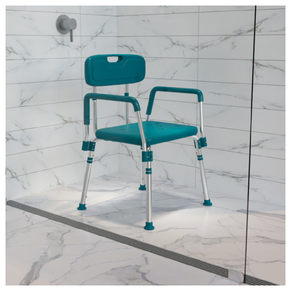 Flash Furniture, DC-HY3523L-TL-GG, Hercules Series Shower Chair, 28" to 33" adjustable height, 300 lb. weight capacity, FSA eligible, plastic seat and back, quick release back and arms, textured seat with drainage holes, arms balance, aluminum frame, non-slip rubber feet, tool-free assembly, FDA approved, teal