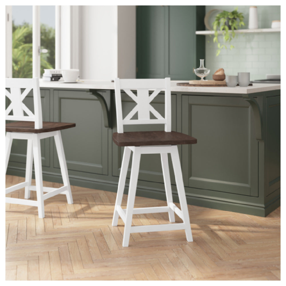 Why choose this model over similar commercial stool options? The Gwendolyn modern farmhouse design features a durable solid wood frame, an ergonomic cross back, and a timeless antique white wash finish that harmonizes with varied decor. Its 225-pound capacity ensures durability and widespread usability, while swivel functionality enhances user interaction in dynamic settings. The combination of high-quality materials, foodservice-ready construction, and a compact footprint sets it apart, promoting efficient space utilization and a welcoming environment in hospitality venues.