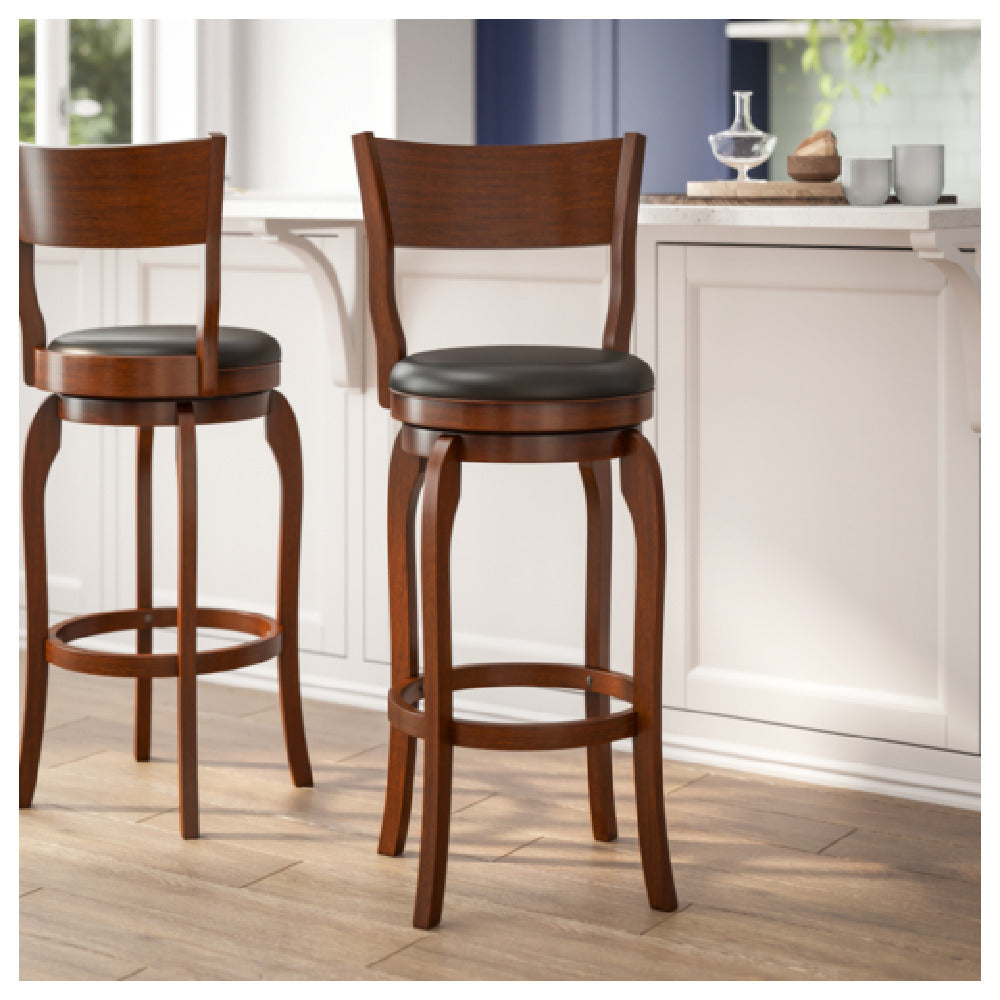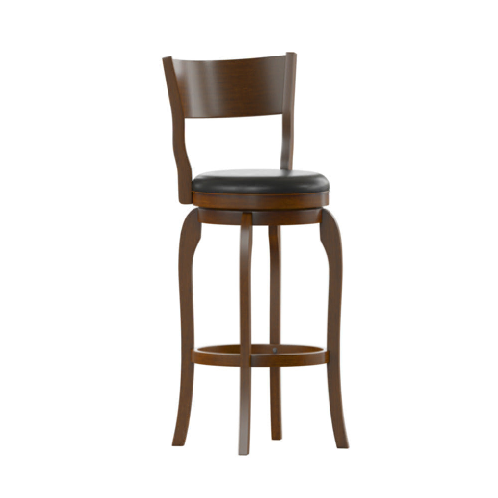 Compared to similar pub stool options, the Flash Furniture ES-NT2-29-OAK-GG stands out with its combination of high-quality LeatherSoft upholstery, elegant bowed wooden frame, and multi-directional swivel functionality. Its durable materials and open-back design streamline maintenance and sanitation, improving operational efficiency and visitor comfort in hospitality venues. This model's balanced build ensures longevity and stable performance in busy commercial environments, making it a reliable choice for foodservice operators.
