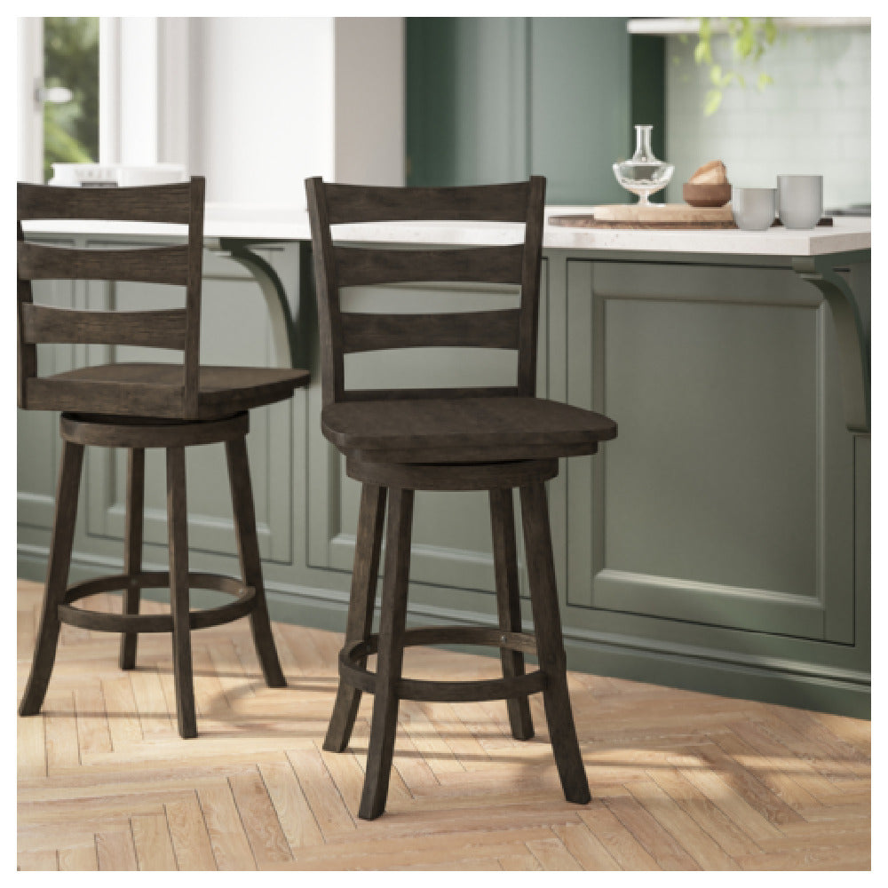 The Flash Furniture ES-UN-31WS-24-GY-GG Liesel Swivel Counter Height Barstool Ladderback is a commercial-grade indoor seating solution designed specifically for foodservice environments seeking durable and ergonomic counter-height seating. Featuring a solid wood seat and ladderback design, this model provides stable, comfortable support with an ample 225 lb. capacity. The gray wash walnut finish enhances its versatility for restaurant, bar, or café settings, while the swivel function facilitates unobstructed movement in dynamic workflows. Its compact footprint and sturdy construction make it an optimal choice for busy hospitality spaces requiring reliable, stylish seating at high-traffic counters or bar areas.