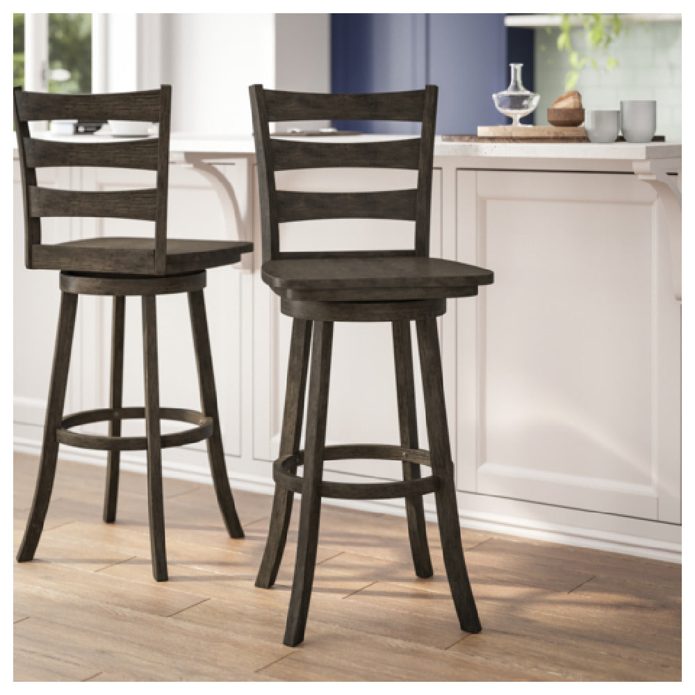 The Flash Furniture ES-UN-31WS-29-GY-GG Liesel Swivel Barstool Ladderback Solid Wood Seat is a commercial-grade indoor seating solution designed for high-durability and comfort in restaurant, bar, and hospitality environments. Crafted with a solid wood ladderback frame and a gray wash walnut finish, this swivel barstool combines stability with style. It features a robust 300 lb. weight capacity and a height of 45.5 inches, making it suitable for bar-height counters and social spaces. Its sturdy construction ensures easy maintenance, with materials optimized for frequent use in busy foodservice settings. The functional design addresses ergonomic needs while enhancing aesthetic appeal, offering precise dimensions to facilitate seamless integration into various commercial spaces.