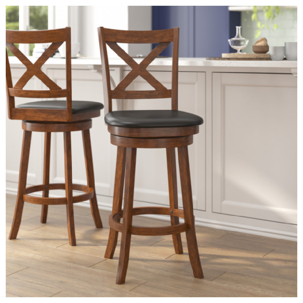 The Flash Furniture ES-UN1-29-OAK-GG Felicity Swivel Barstool is a commercially constructed indoor seating option designed for hospitality environments that require durable, ergonomic, and stylish barstools. Featuring a crossback design and padded LeatherSoft seating, this barstool provides comfort and aesthetic appeal, making it ideal for bars, restaurants, and lounge areas. Built upon a sturdy wood frame finished in antique oak, this model combines timeless style with professional-grade durability, supporting up to 300 lbs. Capacity. Its precise dimensions of 17.5 inches in width and depth, with a height of 43 inches, ensure a balanced, space-efficient fit for high-traffic service settings, while its swivel function enhances user flexibility during intense workflows.