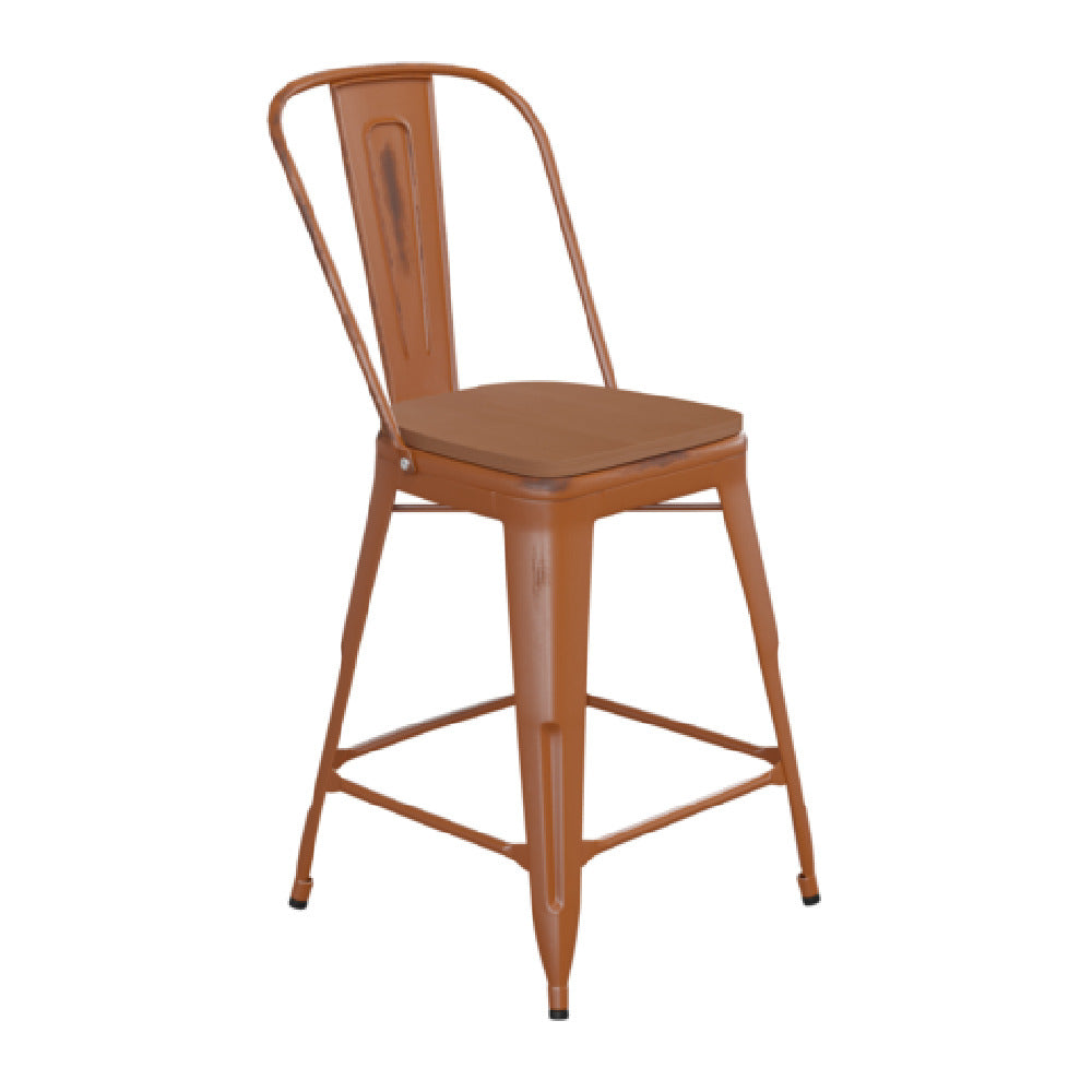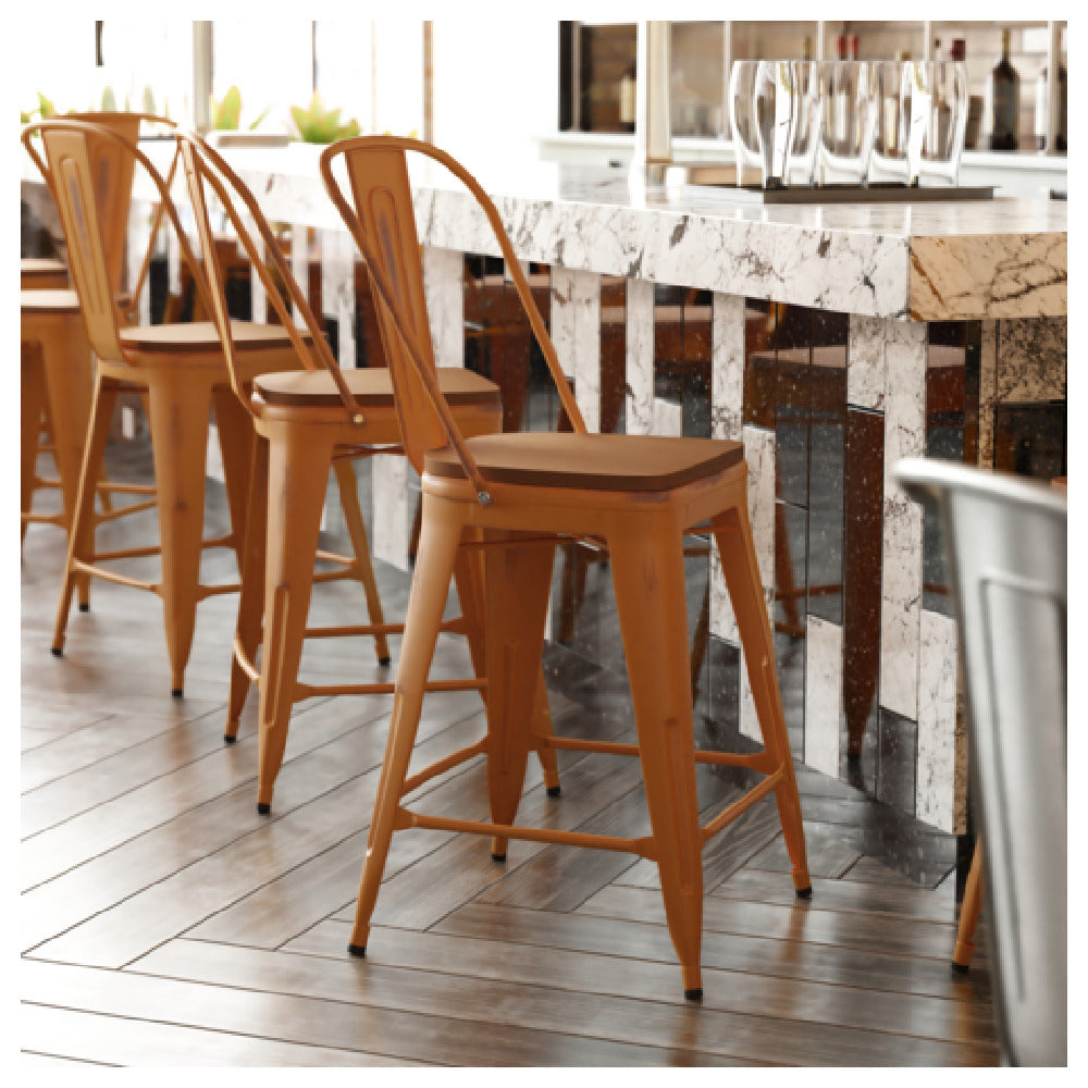A commercial outdoor bar stool is a heavy-duty seating unit engineered for high-use settings like bars, restaurants, or patio spaces, constructed with weather-resistant materials such as steel and polymer. The Flash Furniture ET-3534-24-OR-PL1T-GG Carly Bar Stool exemplifies this category, featuring a counter-height design, durable powder-coated steel frame, and weatherproof resin seat. Typically installed in outdoor dining or entertainment areas, this stool provides stable, comfortable seating suitable for extended use, supporting activities that require robust, easy-to-maintain furniture in high-traffic environments.