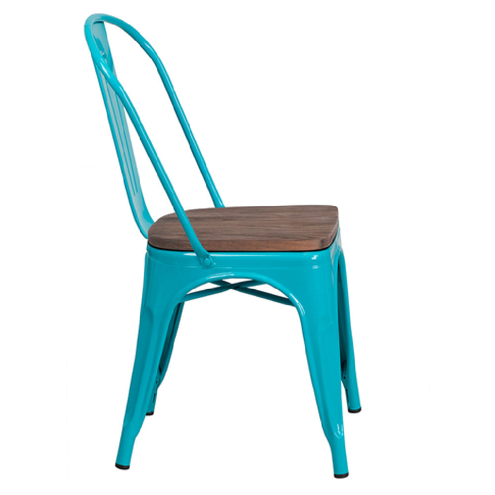 The Flash Furniture ET-3534-CB-WD-GG Stacking Side Chair is a commercial-grade indoor seating solution optimized for high-traffic foodservice environments. Constructed from galvanized steel, it features a durable powder coat finish in teal blue, and a textured wood seat for user comfort. Its metal curved back with vertical slats provides essential lumbar support, while a cross brace with protective plastic caps enhances structural stability. Capable of supporting up to 500 lbs., this chair is stackable up to eight units high, facilitating efficient storage and workflow management in busy establishments. Its design and specifications make it an ideal choice for hospitality venues requiring robust, space-efficient seating options for high-volume use.