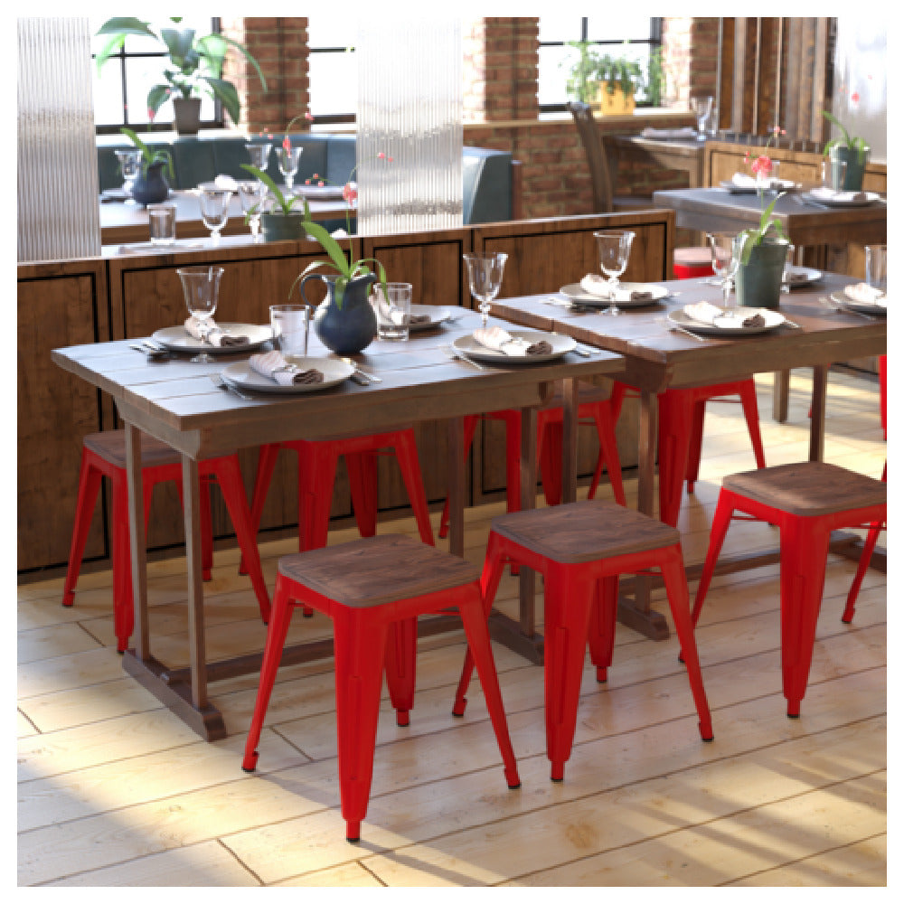 The Kai stool features a robust welded metal frame with a square wooden seat finished in vibrant red, designed for indoor environments with high-use demands. Its dimensions are 15.75 inches in width and depth, with an overall height of 18 inches. Weighing approximately 49 pounds, it supports a maximum load of 250 pounds. Its construction includes plastic floor glides to prevent floor damage during frequent repositioning, making it suitable for fast-paced foodservice workflows. The stool does not require electrical or refrigeration components but emphasizes durability, ease of cleaning, and ergonomic comfort for moderate throughput activities like quick-service counters or casual dining areas. Assembly is required upon delivery, with tools typically included, and it offers a space-efficient stacking capability for storage between uses.