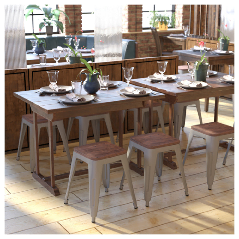 The Kai Stool's construction features a welded steel frame with a silver powder-coated finish for corrosion resistance and longevity in busy foodservice environments. Its dimensions measure 15.75 inches in width and depth, with a height of 18 inches, supporting a maximum weight of 250 pounds. The seat comprises a square wooden top designed for comfort and durability, rated for repeated use in high-volume areas. Assembly is straightforward, with plastic floor glides included to protect flooring and ease movement. The stool’s maintenance involves regular cleaning of the wooden seat surface and occasional inspection of welds for long-term stability. It operates under standard indoor conditions, with no electrical requirements, and its robust metal and wood components are compatible with routine cleaning procedures, making it suitable for installation in bars, cafes, and casual dining settings.