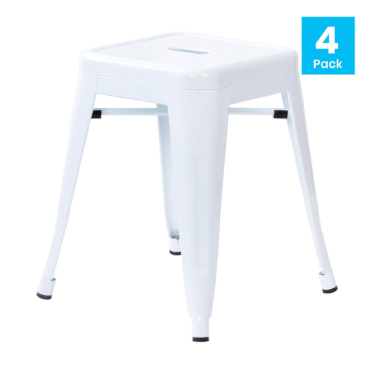 The Flash Furniture ET-BT3503-18-WH-GG Kai Stool is a commercial-grade indoor stacking bar stool specifically designed for high-traffic foodservice environments. Constructed with welded metal framing and a durable square design, this backless 18-inch high seating solution supports up to 250 pounds. Its stackability facilitates efficient storage and streamlined workflow, making it suitable for cafés, break rooms, and casual dining areas requiring versatile, maintenance-friendly seating with plastic floor glides for surface protection.
