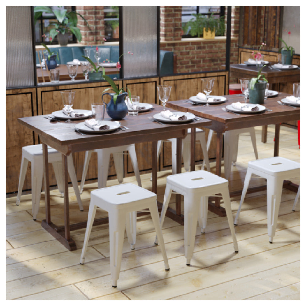 The Kai Stool features a welded metal construction finished in white, with dimensions of 15.75 inches in width and depth, and an overall height of 18 inches. Weighing approximately 35 pounds, this model supports a maximum load of 250 pounds and includes plastic floor glides for surface protection. Its square profile and stackable design optimize storage and mobility in fast-paced foodservice settings. The unit is assembled with welded joints for enhanced durability and requires minimal maintenance. Its key features include a robust frame suitable for moderate workloads in indoor commercial environments, with a focus on longevity and convenience of use. The stool's surface does not specify antimicrobial or specialized cleaning features but is designed for straightforward cleaning routines.