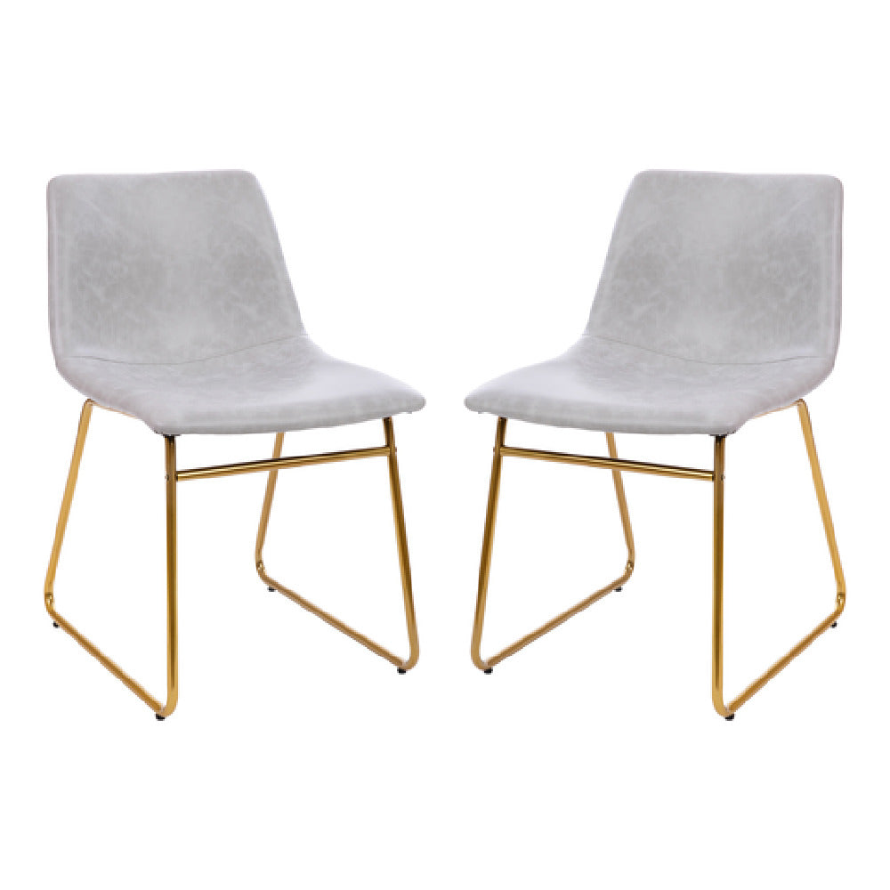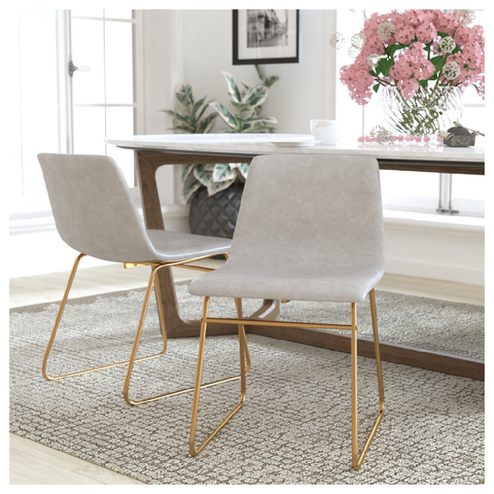 The Flash Furniture ET-ER18345-18-LG-GG features a consistent height of 29 inches and dimensions of 18 inches wide by 21.5 inches deep, with a weight of 34 pounds. Its construction employs a durable metal sled base finished in a gold color, supporting a bonded LeatherSoft upholstered seat and back. The chair's design emphasizes stability, with adjustable floor glides allowing for precise leveling. Its material composition ensures compatibility with frequent cleaning routines typical in commercial kitchen and dining environments. The chair operates without electrical components, focusing on structural durability and user comfort, making it suitable for high-traffic dining areas with moderate workloads and standard maintenance procedures. The product's overall design prioritizes ergonomic stability and ease of integration into existing furnishing schemes, supporting efficient workflows in busy foodservice settings.