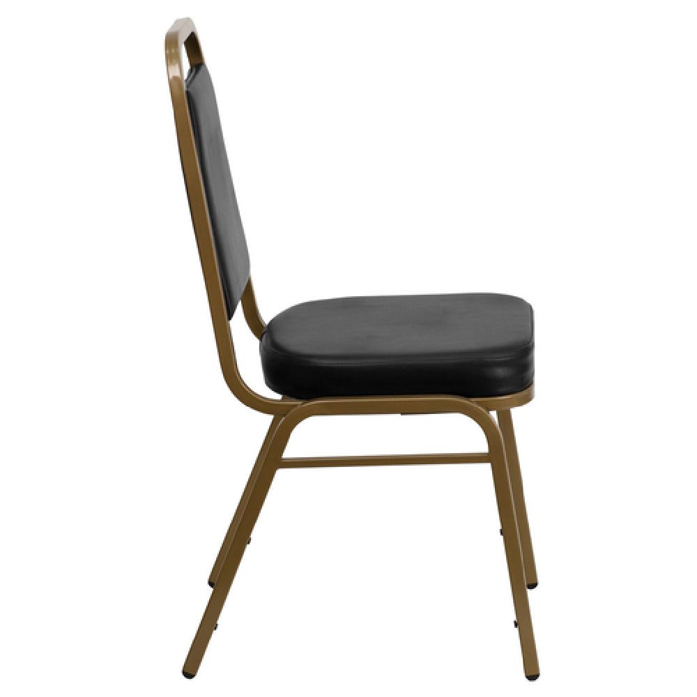 The Flash Furniture FD-BHF-1-ALLGOLD-BK-GG Hercules Series Stacking Banquet Chair is a commercial-grade seating solution designed for high-performance indoor applications. Featuring a robust 16-gauge steel frame with a durable gold powder-coated finish, it ensures long-lasting stability under a 500 lb. weight capacity. The seat and back are upholstered in vinyl with a 2-1/2" thick CA117 fire retardant foam, providing comfort and safety. Its trapezoidal seamless back panel offers structural integrity, making it suitable for banquet halls, conference centers, and event spaces that demand reliable, stackable seating that facilitates efficient storage and handling. This fully assembled chair is engineered for frequent use in demanding environments requiring easy maintenance and maximum durability.