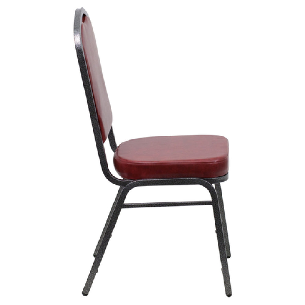 The Flash Furniture FD-C01-SILVERVEIN-BURG-VY-GG Hercules Series Stacking Banquet Chair is a commercial-grade indoor seating solution designed for high-traffic foodservice environments and event venues. This stacking banquet chair features a durable 16 gauge steel frame with a silver vein powder-coated finish, providing corrosion resistance and long-term stability. The seamless crown design back panel, upholstered with vinyl, offers a professional appearance while ensuring ease of maintenance. Equipped with a 2-1/2" thick fire retardant foam seat conforming to CA117 standards, it delivers comfort for extended periods of use. Capable of supporting up to 500 pounds, this chair is ideal for catering, banquet halls, and banquet-style dining arrangements, translating technical strength into practical performance specifications for commercial settings.