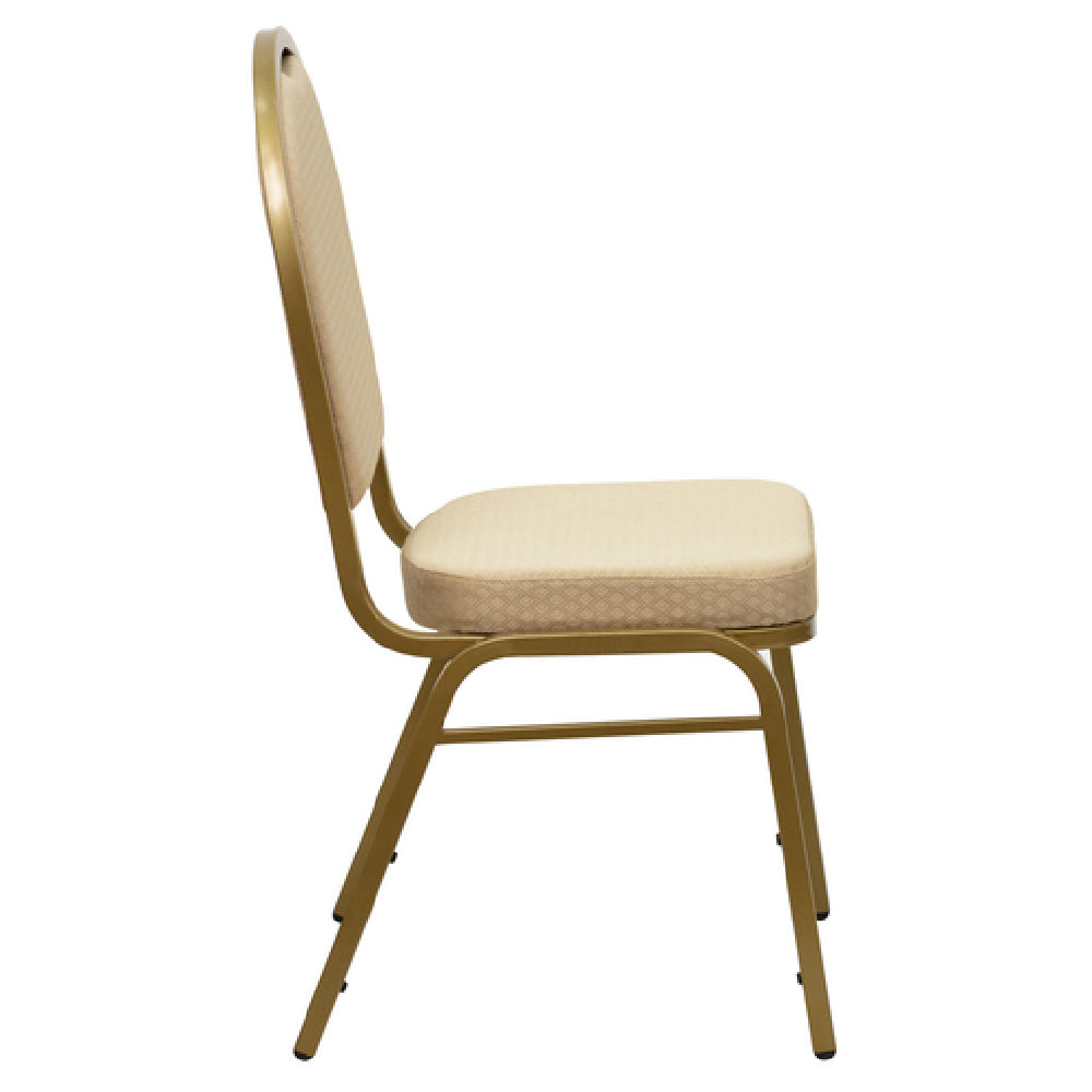 The Flash Furniture FD-C03-ALLGOLD-H20124E-GG Hercules Series Stacking Banquet Chair is a commercial-grade seating solution designed for versatile use in indoor foodservice environments. It features a durable 16-gauge steel frame with a gold powder-coated finish, supporting up to 500 lbs. The chair incorporates a seamless dome back panel and a patterned fabric upholstered seat and back, combining aesthetic appeal with functional strength. Equipped with a 2-1/2" thick CA117 fire-retardant foam seat, this chair ensures safety and comfort for high-traffic dining areas, banquet halls, or event spaces. Its stackability, capacity to hold up to 14 chairs, and fully assembled shipping make it a reliable choice for busy hospitality settings requiring quick deployment and efficient storage.