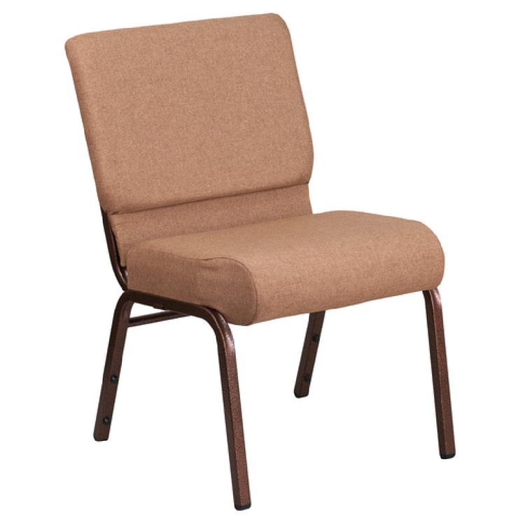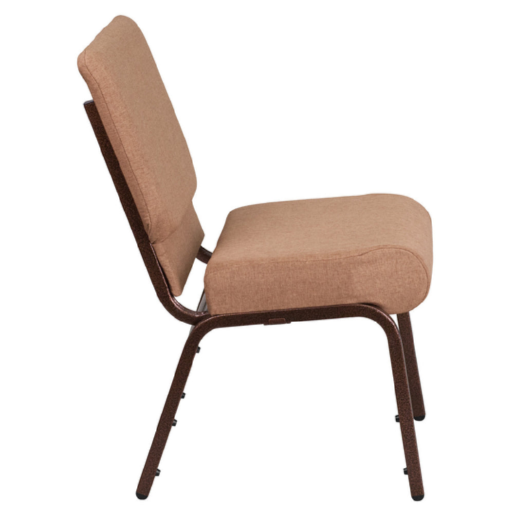 The Flash Furniture FD-CH0221-4-CV-BN-GG Hercules Series Extra Wide Stacking Church Chair is a professional-grade seating solution designed for high-traffic environments such as houses of worship, conference centers, and banquet halls. It features an 800 lb. weight capacity and a durable 16 gauge steel frame finished in copper vein, ensuring long-lasting performance. The chair's fabric upholstery includes a substantial 4" thick seat with a 5" thick waterfall edge, combined with CA117 fire retardant foam for safety compliance. Equipped with a book pouch on the back for convenient storage, this stackable chair offers ease of handling and efficient space management. Precisely engineered for commercial foodservice and event spaces, it serves as a reliable, comfort-focused seating option with technical specs tailored for demanding applications.