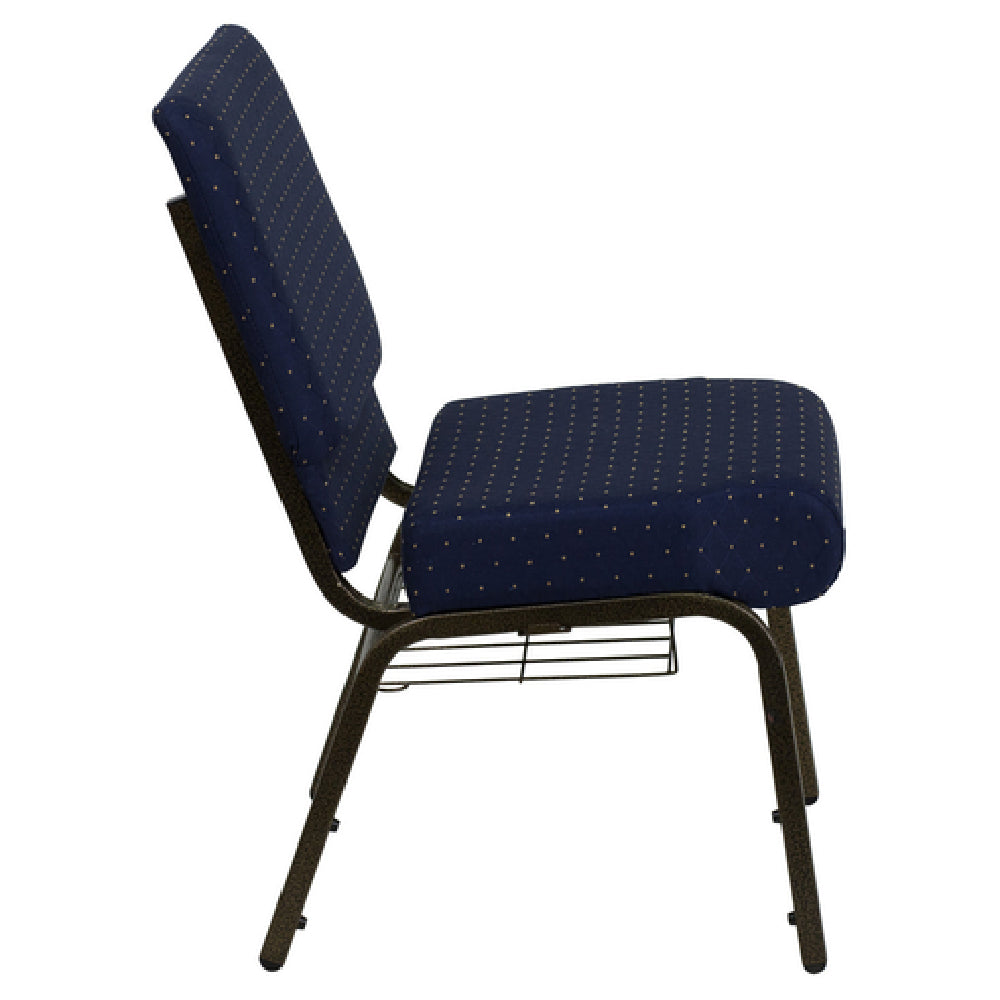 The Flash Furniture FD-CH0221-4-GV-S0810-BAS-GG Hercules Series Extra Wide Stacking Church Chair is a commercial-grade seating solution designed for institutional and congregation spaces requiring durable, ergonomic, and versatile church seating. Constructed with a 16-gauge steel frame finished in a gold vein coating, this chair offers an 800 lb. weight capacity. It features a dot patterned fabric upholstery and a 4-inch thick seat with a 5-inch waterfall edge, optimized for long-term comfort. Equipped with a built-in book pouch on the back and a steel book rack with communion cup holder, the chair addresses the needs of congregations and facilities seeking space-efficient, stackable seating with integrated storage and accessibility for varied functions.