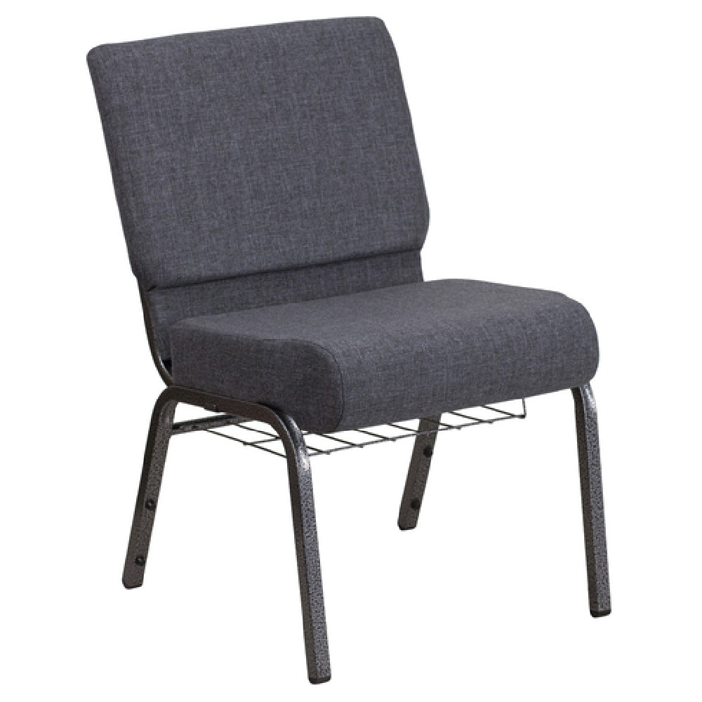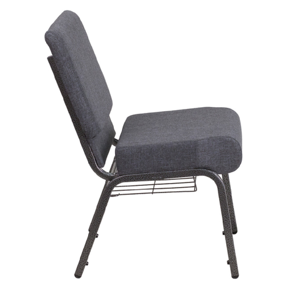 The Flash Furniture FD-CH0221-4-SV-DKGY-BAS-GG Hercules Series Extra Wide Stacking Church Chair is a durable and versatile seating solution designed for institutional and faith-based environments. Crafted with a robust 16-gauge steel frame in a silver vein finish, this commercial-grade chair supports up to 800 pounds. Its fabric-upholstered 4-inch thick seat features a 5-inch waterfall edge for optimal comfort and style, while a book pouch on the back offers convenient storage. Equipped with an integrated steel book rack with a communion cup holder, ganging brackets, and plastic rocker glides, this stackable chair facilitates efficient setup and maintenance. The inclusion of CA117 fire retardant foam enhances safety compliance. Perfect for congregations, auditoriums, and event spaces, this chair combines technical strength with practical features for demanding public and private use.