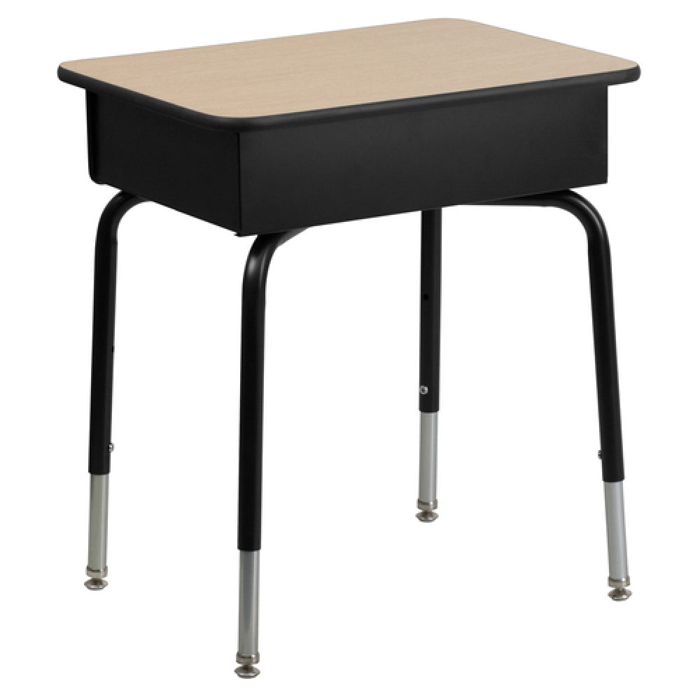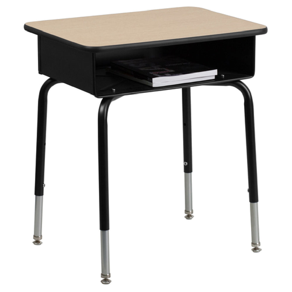 The Flash Furniture FD-DESK-GG Student Desk is a durable industrial-grade classroom workspace designed for educational environments requiring reliable, adjustable study stations. Featuring a 24"W x 18"D high-pressure laminate top with a natural finish and black lacquer edge, it provides a sturdy surface resistant to wear. Its height adjustability from 22-1/4" to 31-1/4" makes it suitable for various student sizes, while a steel tubular criss-cross frame with silver powder coating ensures stability and longevity in high-use settings. The open front metal book box offers convenient storage, and adjustable nylon glides facilitate secure placement. This desk is optimal for elementary to high school classrooms, supporting ergonomic postures and efficient workflow with a 5/8" thick laminate top and steel construction. It is a product that emphasizes precise dimensions and rugged materials for institutional use.