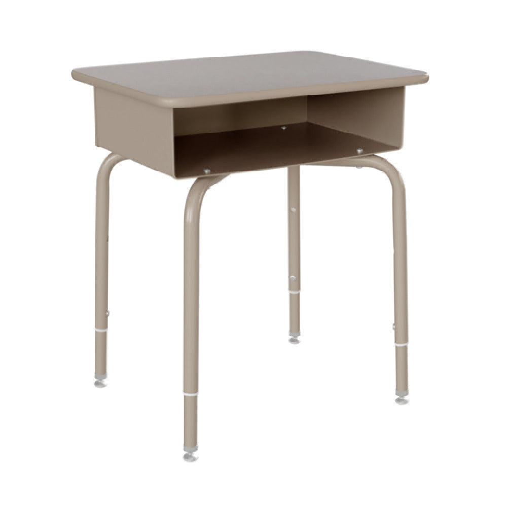 The Billie Student Desk is engineered with a robust steel tubular frame finished in powder coating that ensures corrosion resistance and long-lasting stability. Its modular design allows for easy height adjustment from 22-1/4" to 31-1/4" to accommodate different user ergonomics. The 5/8" thick high-pressure laminate surface offers a resilient workspace resistant to scratches and stains, suited for constant use in educational environments. Its open tray storage structure measures 20-1/2" W x 15" D x 5-1/4" H, providing ample space for textbooks and supplies. The overall weight of the unit is 25 lbs, with a compact footprint of 24" W x 18" D, ensuring compatibility with various classroom layouts. The desk's construction supports frequent cleaning and maintenance, with materials compatible with standard sanitization protocols.