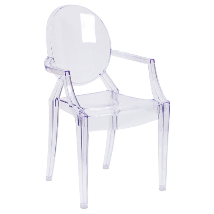 The Flash Furniture FH-124-APC-CLR-GG Ghost Chair offers robust performance with a 400 lb. weight capacity, crafted from molded polycarbonate for high durability. Its stackable design allows efficient space management, with rubber floor glides protecting flooring surfaces. Suitable for outdoor or indoor use, this chair's simple assembly and contoured seat provide comfort and convenience for busy commercial foodservice environments. The plain back and curved arms optimize ergonomic support, fitting seamlessly into various event or hospitality workflows.