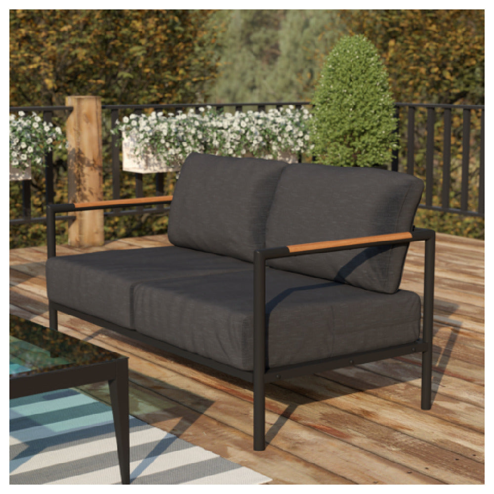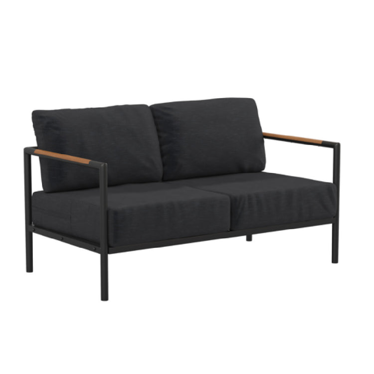 The Flash Furniture GM-201027-2S-CH-GG Lea Patio Loveseat is a commercial-grade outdoor seating solution designed for high durability and comfort in hospitality and outdoor dining environments. Featuring a robust black powder coated aluminum frame and teak arm accents, this loveseat supports up to 600 pounds, providing reliable performance for guest lounges, patio areas, or poolside settings. The fabric back and seat cushions enhance comfort while maintaining resistance to outdoor elements, making it suitable for moderate-volume outdoor foodservice applications requiring resilience and easy maintenance.