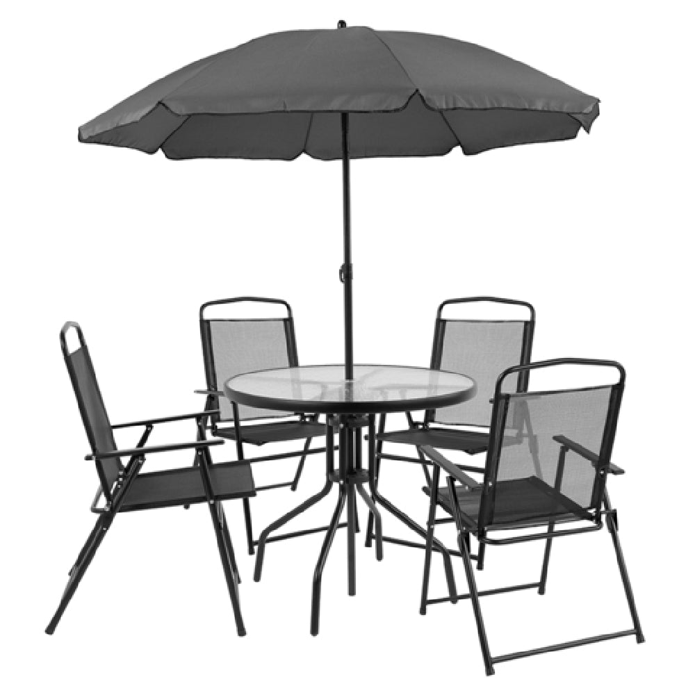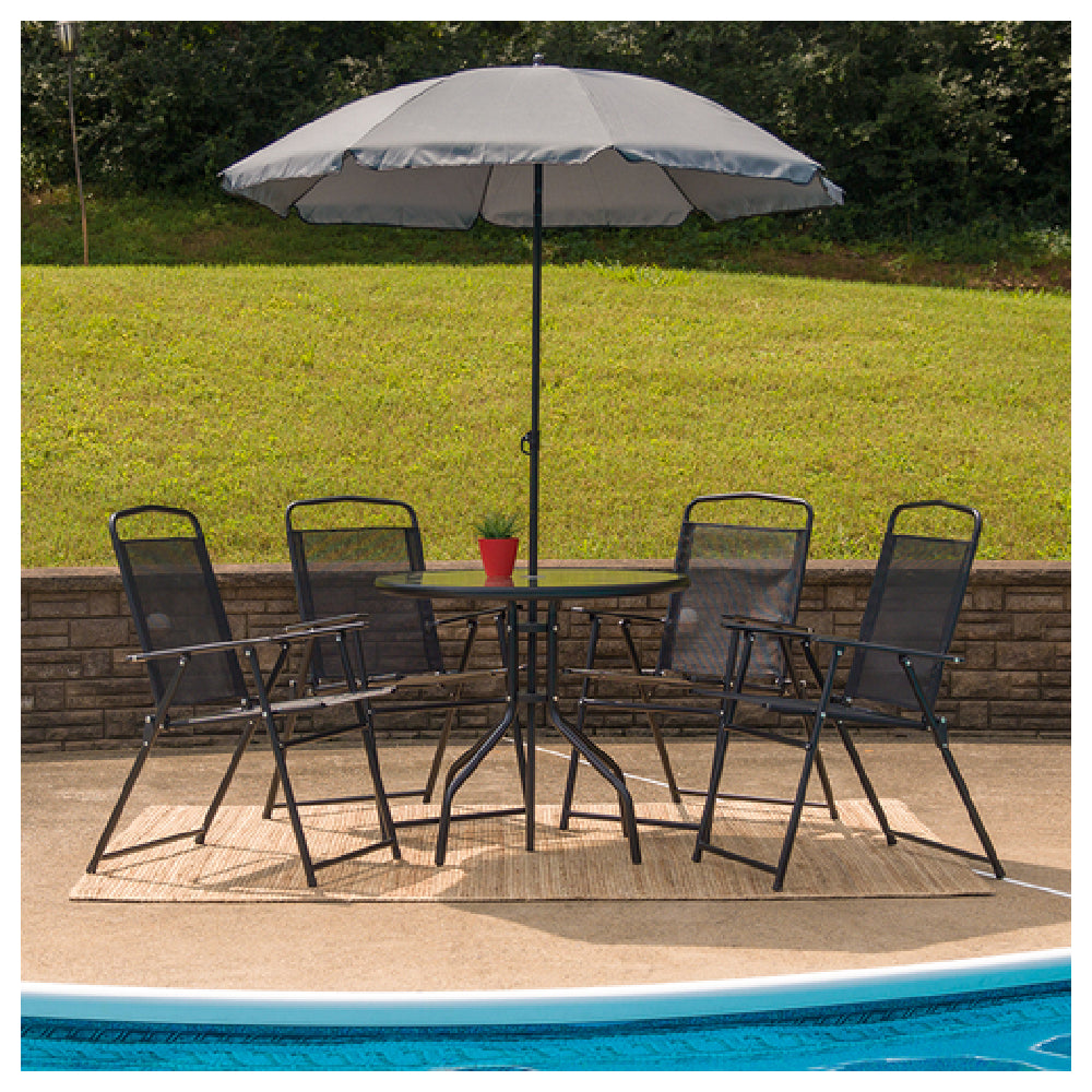 Flash Furniture, GM-202012-BK-GG, Nantucket Patio Table Set, includes: (1) table: 31-1/4" dia. x 28"H, round, 5mm thick glass top, 1-1/2" edge, (1) umbrella: dark gray with black trim, steel pole extends to ground, (4) folding arm chairs: textilene upholstered back & seat, protective plastic floor glides, powder coat finish, black