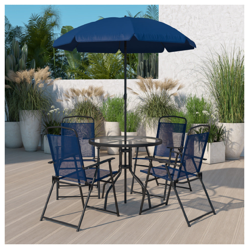 The Flash Furniture GM-202012-NV-GG Nantucket Patio Table Set features a 28-inch high round table with a 31-1/4-inch diameter, constructed from corrosion-resistant steel with a powder-coated finish in navy blue. The glass top measures 5mm in thickness, providing durability and safety for outdoor environments. The set includes four folding chairs made with textilene upholstery, which offers weather resistance and ease of cleaning. The umbrella features a steel pole that extends to ground level, supporting a navy blue canopy designed for shade and weather protection. The set weighs approximately 59 lbs, facilitating flexible positioning and handling. Designed for moderate outdoor usage, the set withstands typical weather conditions, with dimensions suitable for crowded patio spaces. The materials used are food-safe and easy to clean; the glass surface is resistant to stains and spills, and the powder coat resists corrosion. The overall construction emphasizes stability, safety, and effortless maintenance, aligning with outdoor commercial furniture standards.