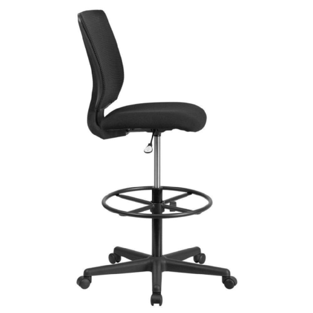 This ergonomic drafting stool offers dynamic adjustability and durable materials tailored for demanding professional work environments. Its flexible mesh back promotes airflow, maintaining user comfort during extended periods of use, while the padded seat provides support. The height adjustment mechanism facilitates seamless transitions for varying tasks and user preferences. Featuring a heavy-duty nylon base and dual-wheel casters, the stool ensures stability and smooth mobility across office floors. Designed without arms, it enables unobstructed movement within compact workstations, ideal for design and technical workflows.