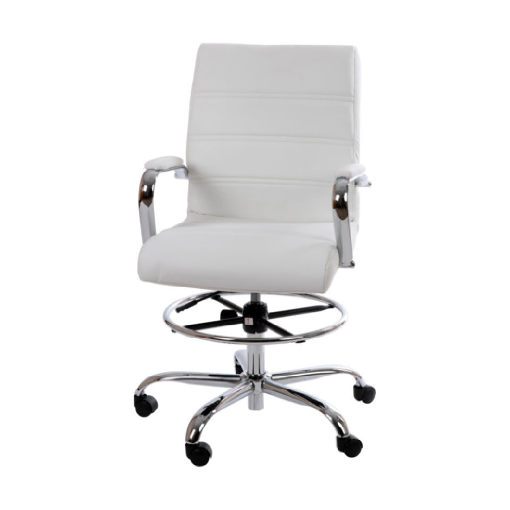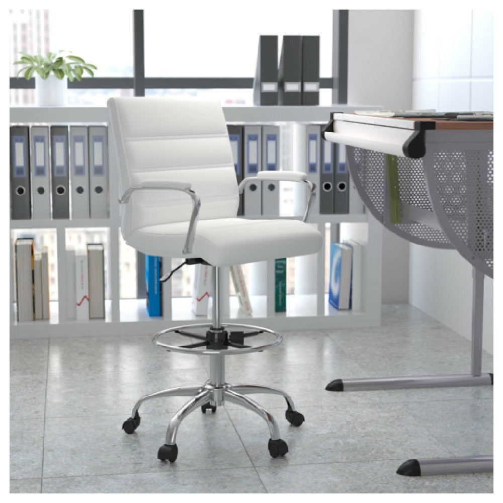 The Flash Furniture GO-2286B-WH-GG Whitney Drafting Chair offers commercial-grade adjustability and durability tailored to professional workspaces. Its pneumatic height adjustment enables precise seat positioning, while the LeatherSoft upholstery withstands frequent use and cleaning. Designed for medium-volume drafting and design applications, it supports ergonomic workflow and effortless mobility with its chrome base and dual-wheel casters.
