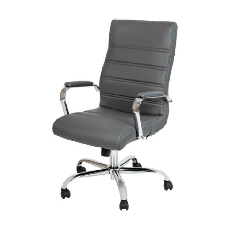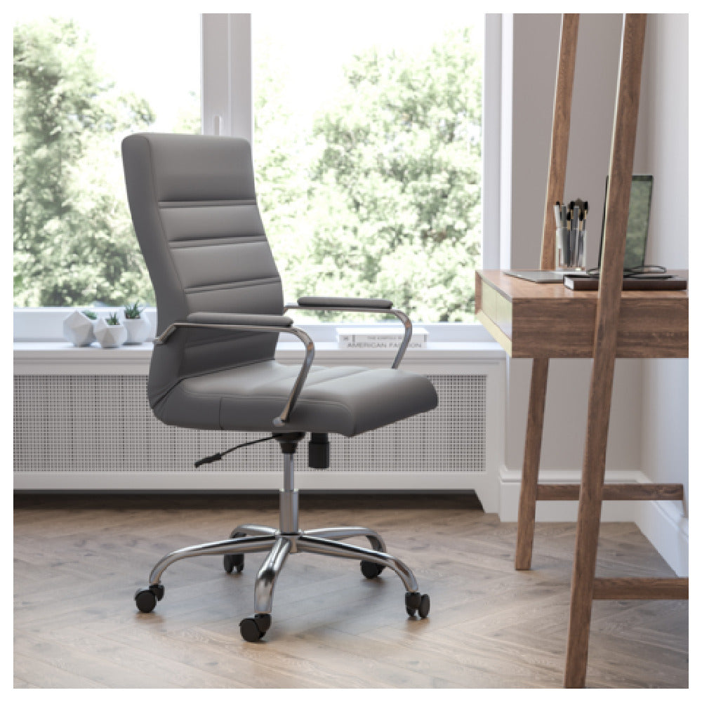 The Flash Furniture GO-2286H-GR-GG executive swivel chair integrates a sturdy construction with precise dimensions, including a seat height adjustable from 39-1/4" to 43". Made with a chrome base and dual wheel casters, it supports up to 250 pounds. The chair features a high back with upholstered bonded leather, padded arms, and a waterfall seat edge designed to reduce pressure on the legs. Its tilt lock mechanism with tension control allows seamless ergonomic adjustment, while its fire-retardant foam enhances safety compliance. The overall weight of the chair is 35.4 lbs, with a width of 26" and depth of 27", making it suitable for both dense and spacious office layouts. Designed for long-term use, it requires minimal maintenance and is constructed for durability in high-use environments.
