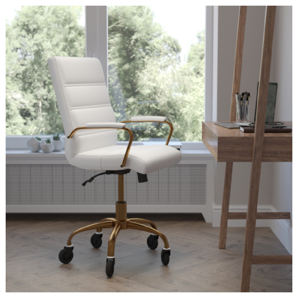 The Flash Furniture GO-2286M-WH-GLD-RLB-GG Camilia Executive Swivel Office Chair is a professional-grade seating solution designed for executive and managerial workspaces. This high-performance office chair features an adjustable height range of 37" to 40-3/4", optimized for ergonomic comfort and adaptability. Constructed with LeatherSoft upholstery, it offers durability in frequent use environments while supporting up to 250 pounds. The mid-back design provides posture support, complemented by a waterfall seat for enhanced leg circulation. Built-in lumbar support and padded gold arms contribute to ergonomic efficiency, making this chair suitable for prolonged periods of active office work in corporate settings and administrative offices.