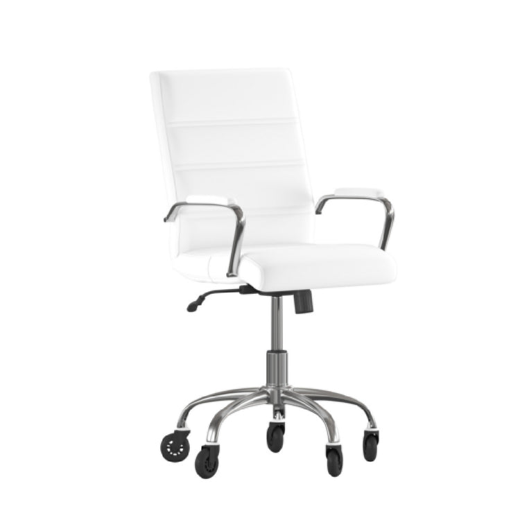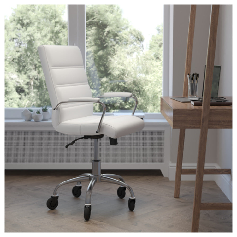 The Flash Furniture GO-2286M-WH-RLB-GG Camilia Executive Swivel Office Chair represents a professional seating solution designed for modern office environments requiring versatile ergonomics and durable construction. This mid-back swivel chair features adjustable height from 37" to 40-3/4", a weight capacity of 250 lbs, and incorporates LeatherSoft upholstery for comfort and resilience. Its ergonomic design includes built-in lumbar support, padded arms, and a waterfall seat to promote proper posture during extended periods of work. The chrome base with poly roller casters ensures stability and mobility, making it suitable for executive offices, conference rooms, and administrative areas requiring high-performance seating with easy adjustability and durable materials.